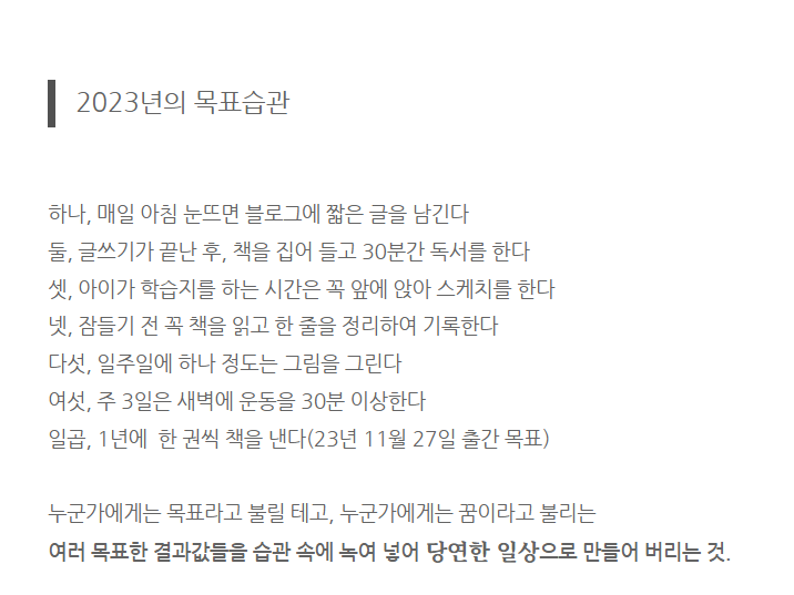위의 다짐을 했던 2023년 1월의 난 아마도 전자에 가까운 근자감으로 가득 차 할 수 있다 뻥뻥 소리치고 이것저것 크고 작은 목표들을 써 내려갔던 듯하다. 하지만 누군가 그랬다. 내가 할 수 있다 믿으면 할 수 있는 것이라고.