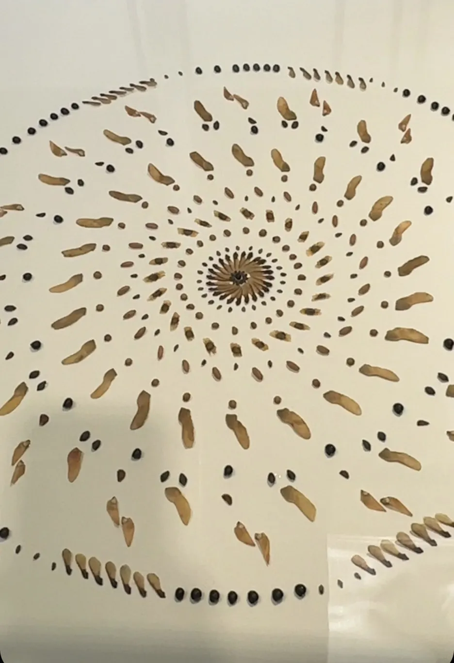 사진 오른쪽 아래, 씨앗을 빙 둘러놓은 작품과 곶감의 데빌버전 같은 악마의 솜. 영어 이름도 [devils cotton] 이란다. 이름답지 않게 유용하고 이로운 식물인데 낚싯줄, 밧줄 등을 만들 때 사용되고, 생리통 같은 통증완화에 사용되는 약용식물이라고 한다. (실생활에서 만날 일은 별로 없겠지만 만지면 염증이 생길 수도 있다고 하니 주의할 것.)