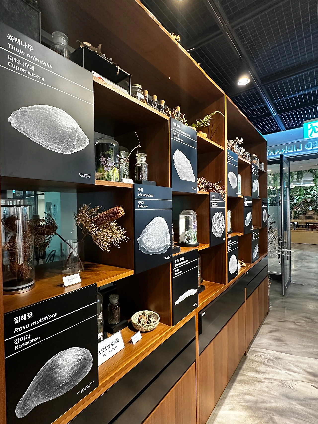 도서관은 입구에서 한눈에 맵이 보일 정도로 작은 공간이었다. 우드벽장을 활용해 식료품점처럼 저장병이나, 자루에 한가득 담아 작은 존재를 가시화하거나 돌기나 모양, 색깔 등 특징이 있는 씨앗들을 확대하고 펼쳐 보인다. 작고 평면적인 소재로 도서관이란 공간을 채운다는 건 기획하는 사람의 고민이 꽤 많았을 것도 같다.