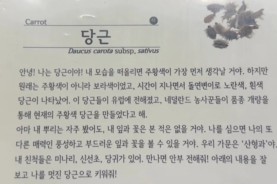 그래, 이번엔 당근이다. 한 번 가봐야지 싶었던 씨앗도서관에서 마침 ‘흰 당근 씨앗’을 빌려준다기에 마곡 식물원을 방문하게 되었다. 씨앗도서관이란 존재도 신박했지만 대여 리스트에 소개된 흰 당근은, 좀 낯설었다. 우리가 알고 있는 주황당근은 네덜란드에서 품종 개량 된 것이란다. 당근은 원래 본투비 보라색이며 흰, 노란 계열 당근은 돌연변이라는 사실.