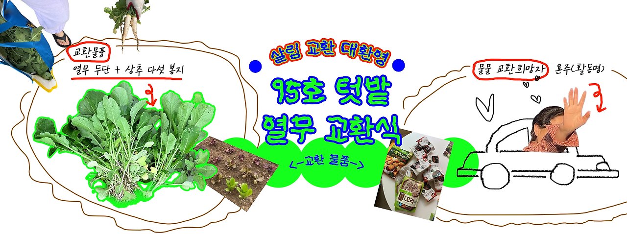 날이 갈수록 해가 뜨거운 관계로 이슬 내린 어느 선선한 새벽에 상추 다섯 봉지+ 하루 전날 따 둔 열무 두 단이 든 쇼핑봉투를 챙겨 ‘상추열무 교환식’을 준비했다. 내 오늘 살림 밑천 두둑이 챙겨보리라.