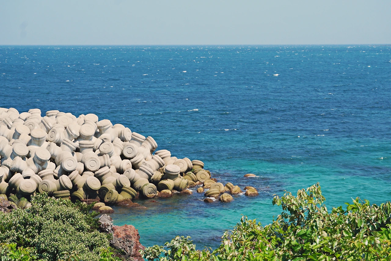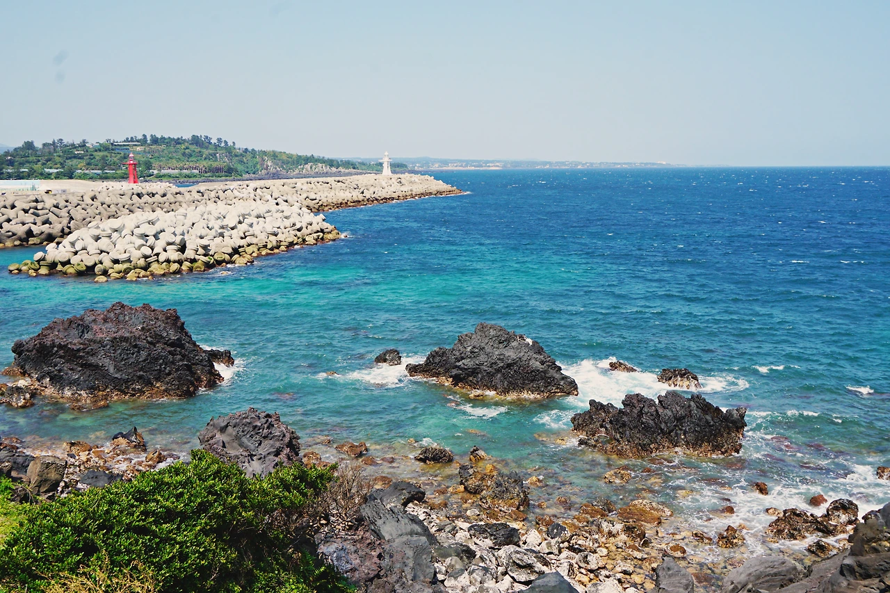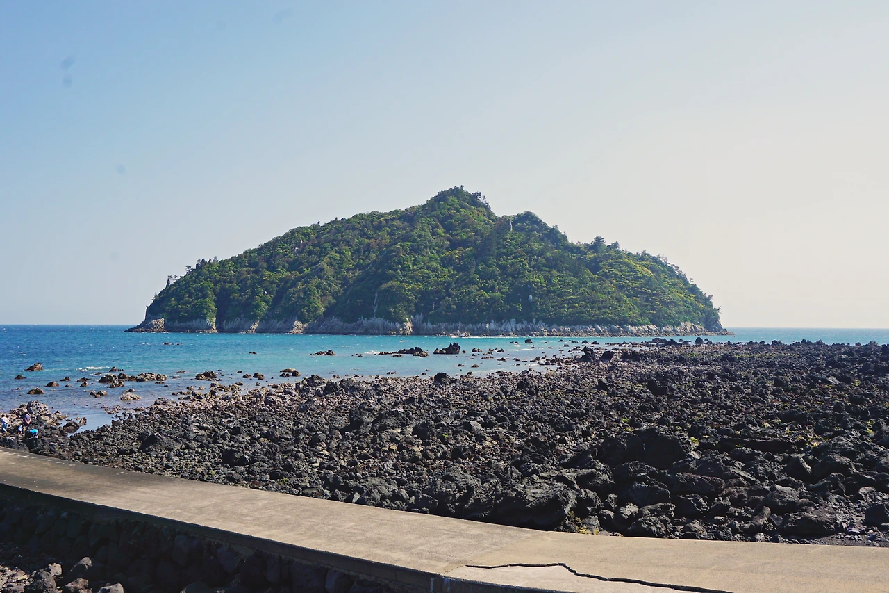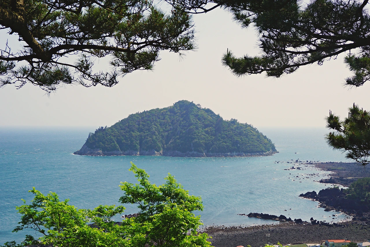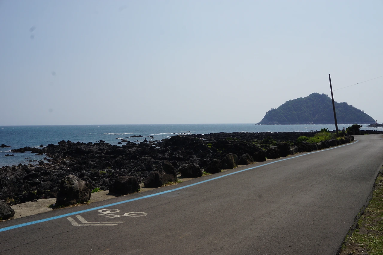 쇠소깍을 벗어나 구불구불하게 이어지는 길을 걷는다. 방파제가 길게 뻗어있는 하효항의 쪽빛 바닷물이 풀 숲 사이로 드문드문 모습을 드러낸다. 햇볕이 바다 위에 쉴 새 없이 떨어지며 반짝이는 물결을 만들어내는 풍경. 넋을 놓고 감탄하며 1km쯤 걸었을까. 드디어, 저 멀리 바다 위에 둥둥 떠있는 작은 섶섬이 보인다.