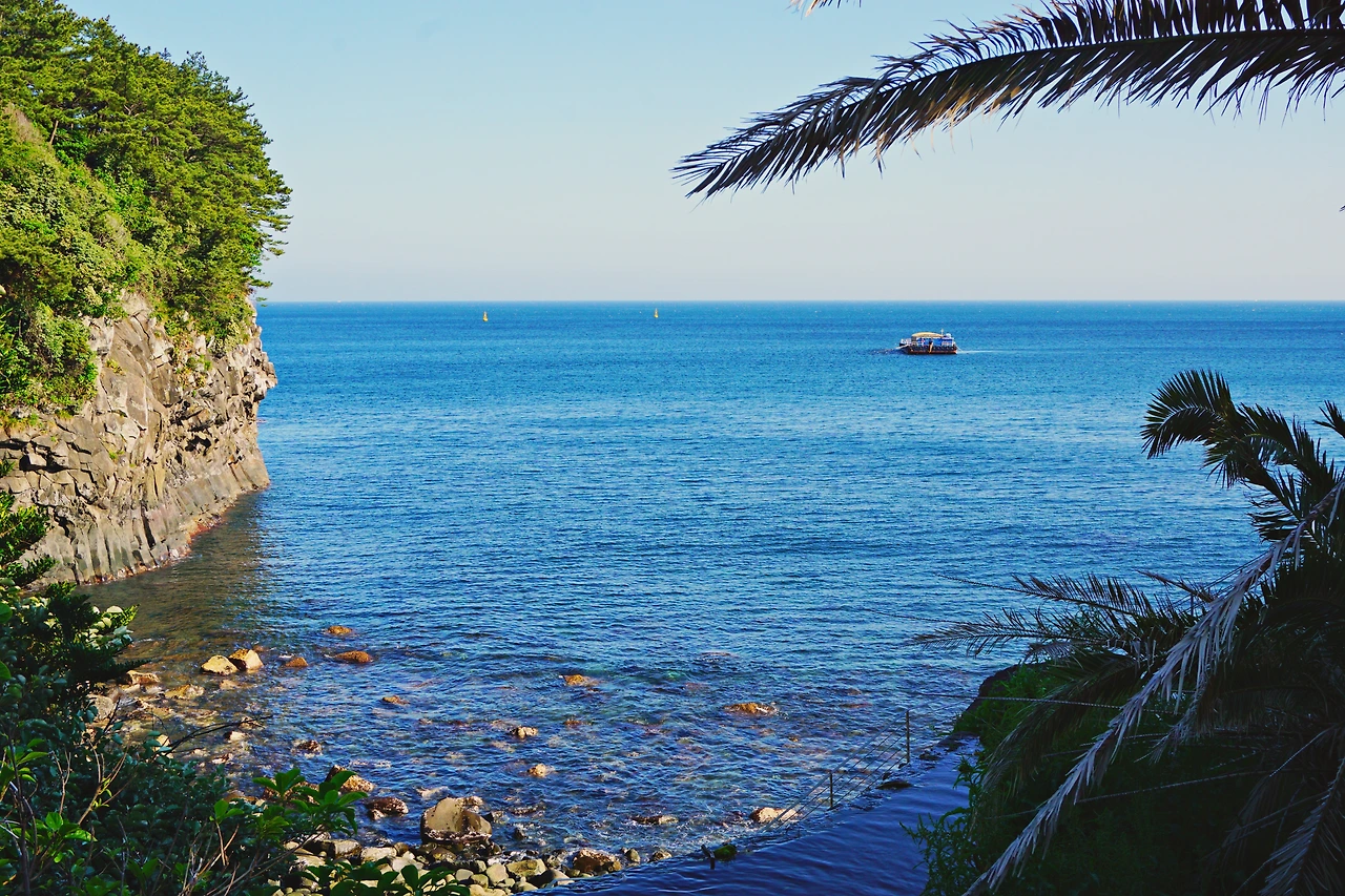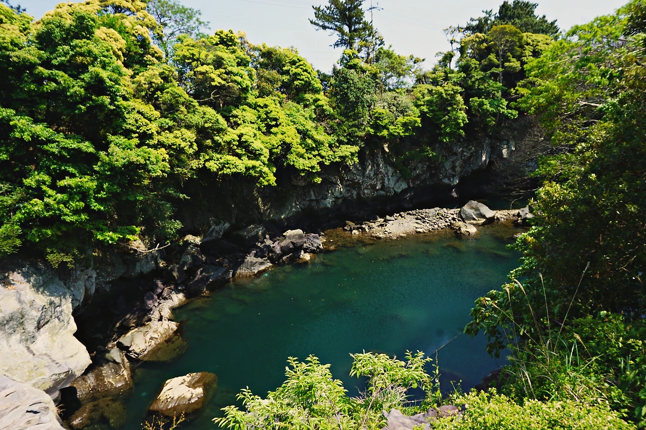 아직 달아나지 않은 피로 곰을 어깨와 다리에 한 마리씩 매달고 내디딘 걸음은 묵직했다. 시작 스탬프를 찍고 해가 쨍쨍한 산책로를 몸풀기하듯 걸어가 들어선 곳은 유명한 제주의 관광명소, 쇠소깍. 예로부터 우리 조상의 어업기지인 천연 어항으로서, 우돈 지명을 딴 '우소(쇠소)'에 하천의 하구 부분으로 바다와 만나는 곳을 일컫는 제주어 '깍'을 더해 쇠소깍이라 한다. 옛 조상들은 쇠소에 용이 산다고 하여 용소라 부르기도 했다. 하천의 하구와 바다가 만나는 깊은 계곡이라 그런 걸까. 바위 위에서 물을 내려다보고 있는 우거진 숲의 색이 비친 걸까. 쇠소깍의 물은 파란색인 듯 초록색에 가까운 참으로 오묘한 색을 띠고 있다.