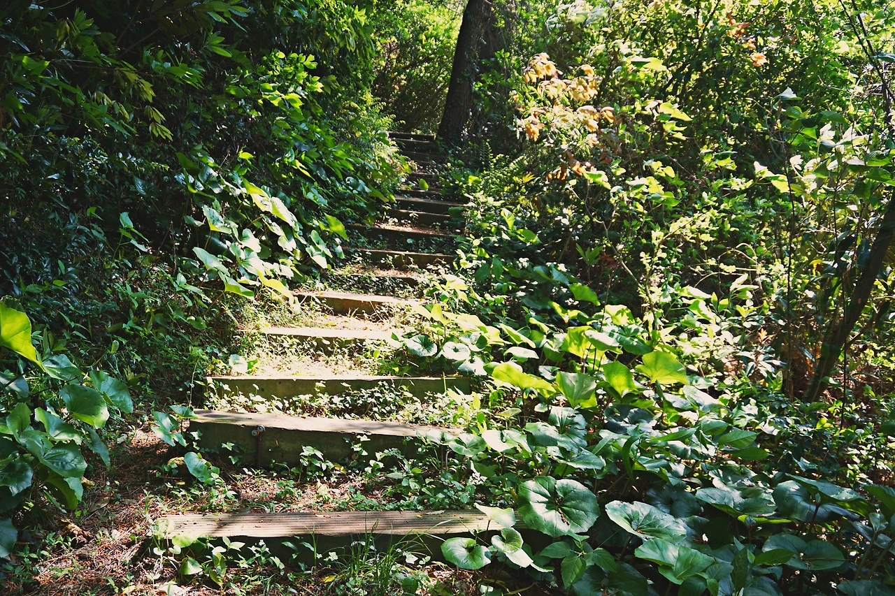 친절한 6코스는 올레길 메이트, 섶섬이 사라져 힘이 빠질 때쯤 우회로를 선물했다. 제주올레 가이드북의 지도를 보며 다녔던 우리에게는 우회로에 대한 사전 정보가 없었는데. 보목 하수처리장을 지나 검은여 해안로가 끝나는 서귀포 칼호텔 입구로 가기 전, 철망에 붙어있는 우회로 안내판을 발견했다. 기존의 올레길인 험한 바닷길 대신, 칼호텔 내부 우회로를 따라갈 수 있는 길이었다. 강한 햇볕에 노출된 채로 8km가량을 걸어 체력이 많이 떨어진 터라, 우리는 안내에 따라 우회로를 걷기로 했다. 이 길의 경우, 초반의 숲길을 지나고 나면 그리스나 이탈리아와 같은 이국적인 분위기의 칼호텔 주변을 따라 정돈된 길이 이어진다. 소라의 성(중간 스탬프)을 지나고부터 정방폭포를 향해 계속되는 산책길은 야자나무와 열대식물들이 양 옆으로 줄지어 있고 나무 데크로 길을 단장해놓아 시간을 생각지 않고 천천히 여유로운 걸음을 걷게 하는 힘이 있었다. 꼭 올레길을 걷지 않더라도, 칼 호텔에 머물거나 정방폭포를 찾게 된다면 산책로로 선택해도 좋을 법한 아름다운 길이다.