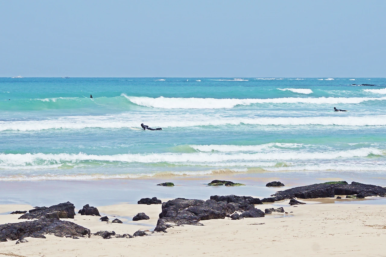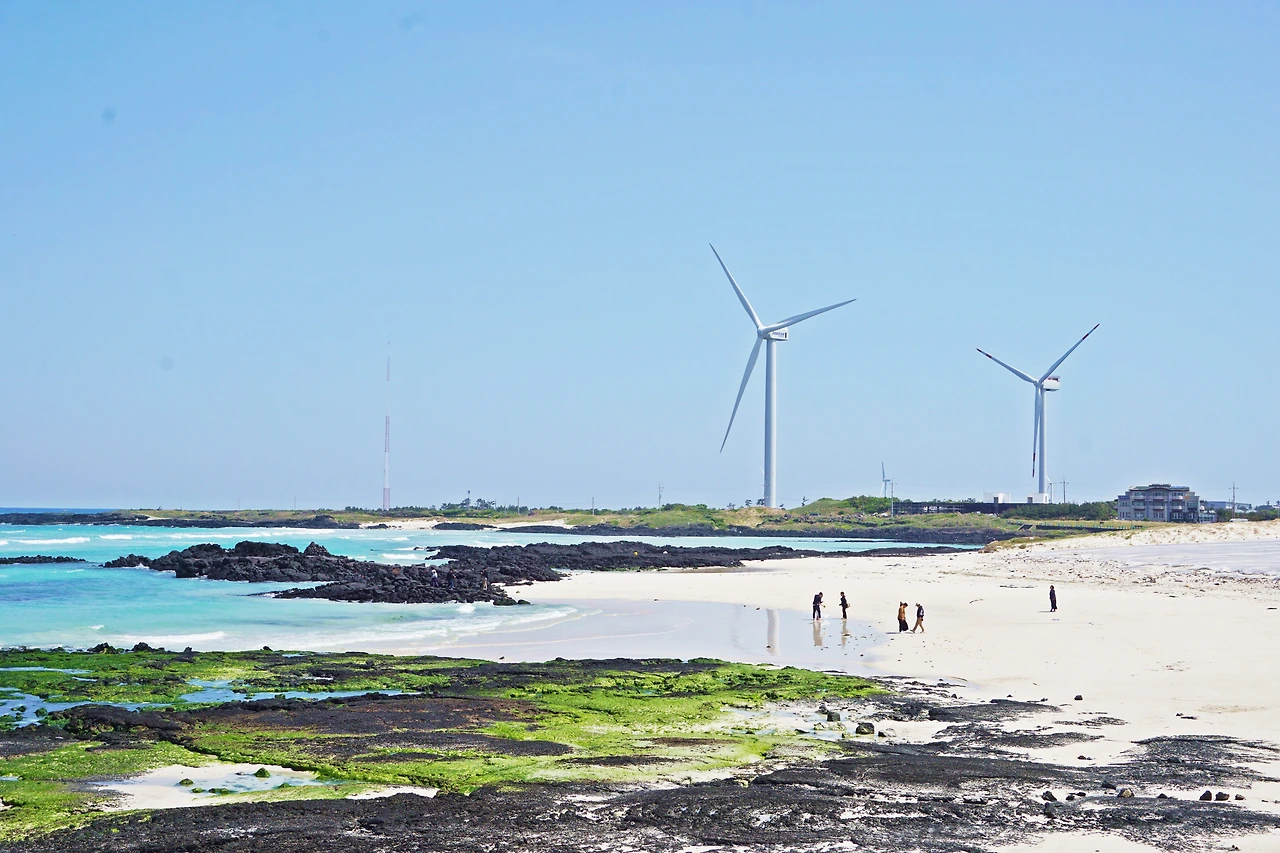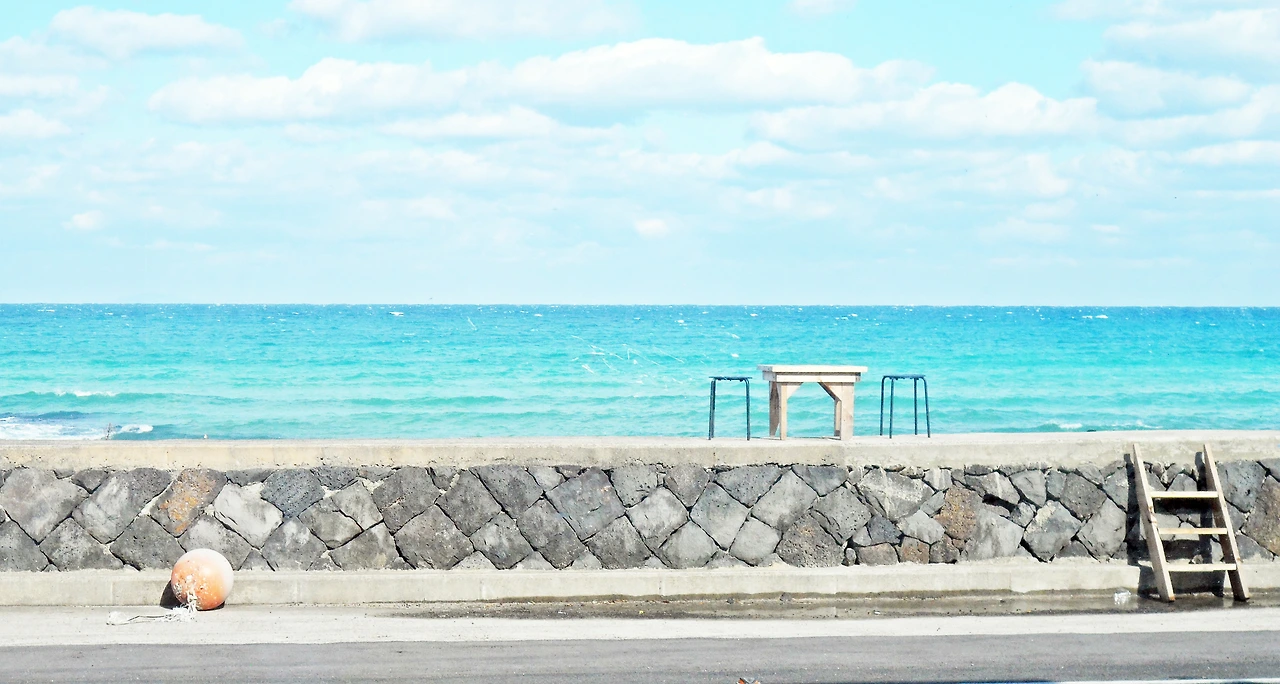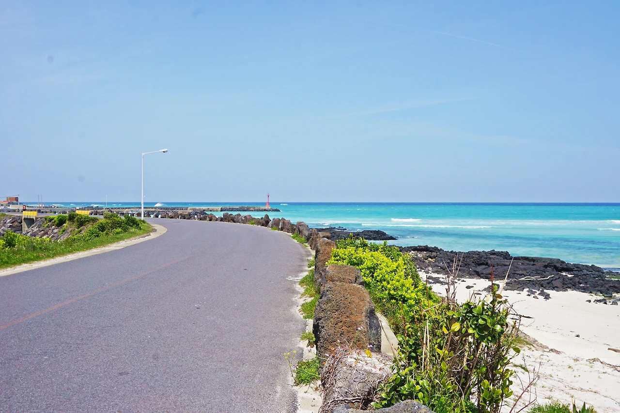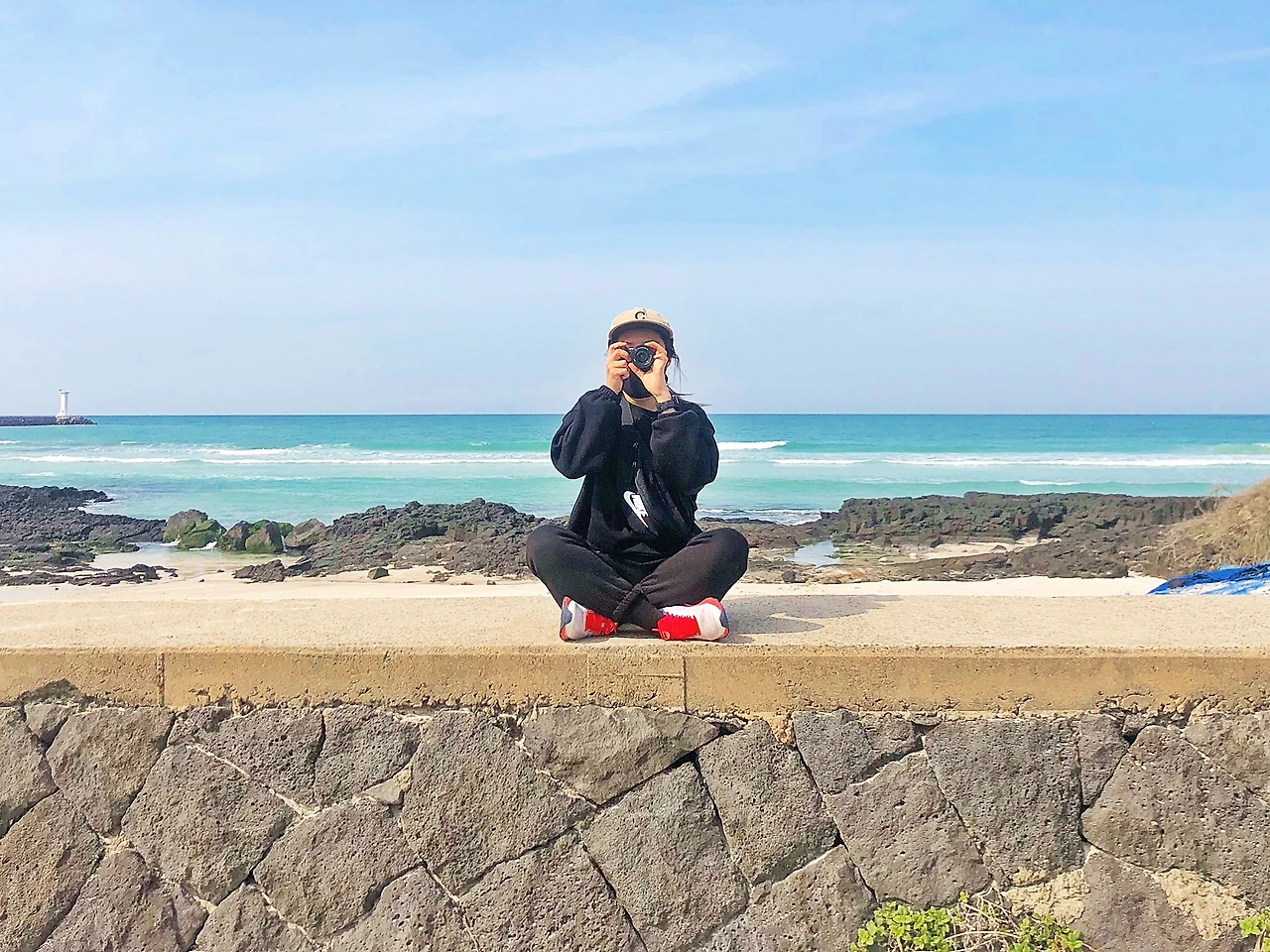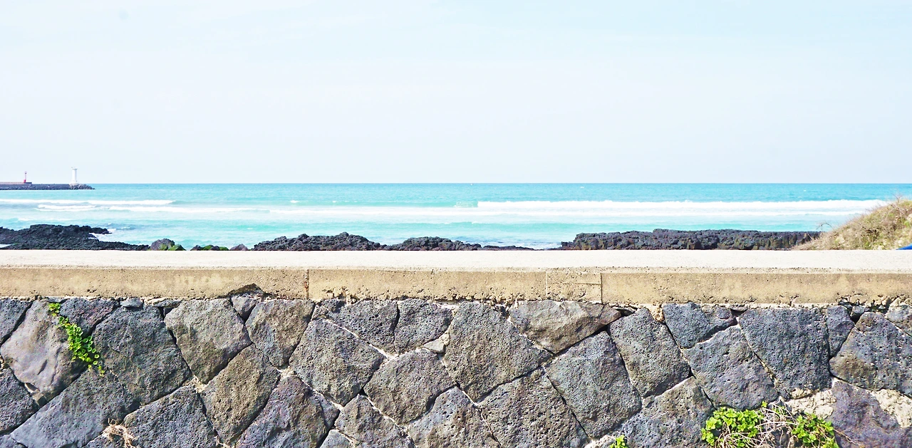 벽화에 빠져 걷다 보면 자연스럽게 골목의 끝자락에 이르러 김녕리의 맑은 바다가 눈 앞에 펼쳐진다. 푸른빛 물결 위 조금씩 드러나있는 검은 돌 위에서 삼삼오오 모여 저마다 다른 자세로 낮잠을 청하는 여유로운 새들의 모습도 이따금 만날 수 있다. 물감을 칠해놓은 듯 아름다운 에메랄드 빛깔, 유독 투명한 바닷물과 조개류 껍데기로 이루어진 새하얀 모래가 드넓게 펼쳐져있는 곳. 평균 수심이 1~2m로 얕고 물결이 잔잔해 많은 여행자들이 사랑하는, 또 그와 내가 사랑하는 김녕 성세기 해변이다. 바다가 잘 내려다보이는 곳에 자리를 잡고 잠시 걸음을 멈췄다. 여기 기억나? 한마디에, 해변을 바라보던 우리는 서로에게 손을 내어주었고 옅은 미소를 지어 보였다.
