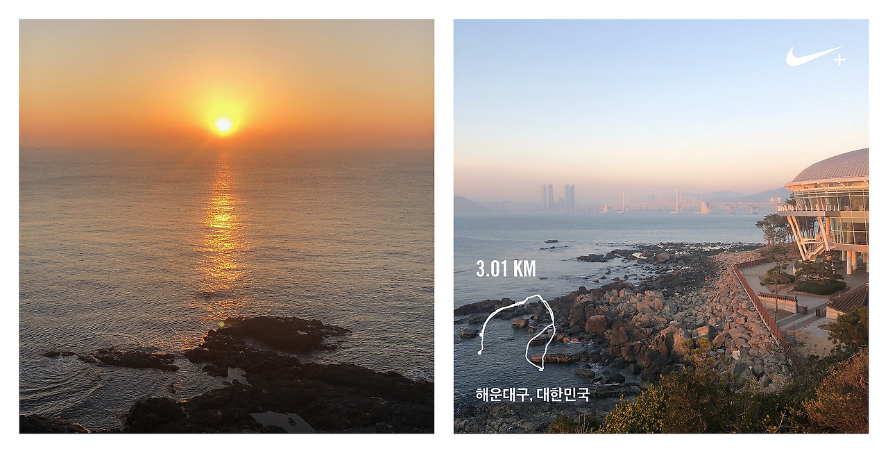 어디를 여행하던 하루 정도는 꼭 일출을 보려고 노력하는 그와 나는 그 지역의 명소에서 일출도 보고 상쾌한 아침 공기를 맞으며 건강하게 하루를 시작할 수 있는 '일출 러닝'을 좋아한다. 떠오르는 해와 철썩이는 바다를 옆에 두고 영일대해수욕장 해안산책로를 달렸던 포항 여행, 숙소가 있던 해운대구 마린시티 해안산책로에서 동백섬 전망대까지 달려 일출을 보고 다시 돌아왔던 부산여행은 달리기 딱 좋을 만큼의 선선했던 날씨와 맑은 하늘 그리고 선명한 해를 볼 수 있었기에 유독 잊히지 않는다.