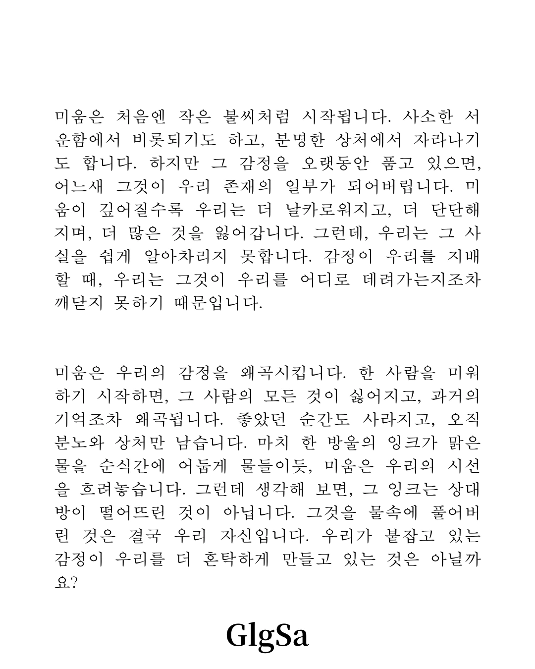 시간이 지날수록 미움은 우리를 지치게 만듭니다. 미움은 강한 감정이기에 지속하려면 에너지가 필요합니다. 그 감정을 유지하려면 계속해서 기억을 되새기고, 스스로를 불타오르게 해야 합니다. 하지만 그렇게 살아가다 보면 결국 가장 지치는 것은 우리 자신입니다. 그렇다면, 우리는 무엇을 위해 그렇게 에너지를 쓰고 있는 걸까요? 미움을 품고 있는 동안, 우리는 온전히 행복할 수 없습니다. 그런데도 우리는 그 감정을 쉽게 놓지 못합니다. 어쩌면, 미움이 사라지면 우리 안에 남는 것이 너무 텅 비어버릴까 봐 두려운 것은 아닐까요?