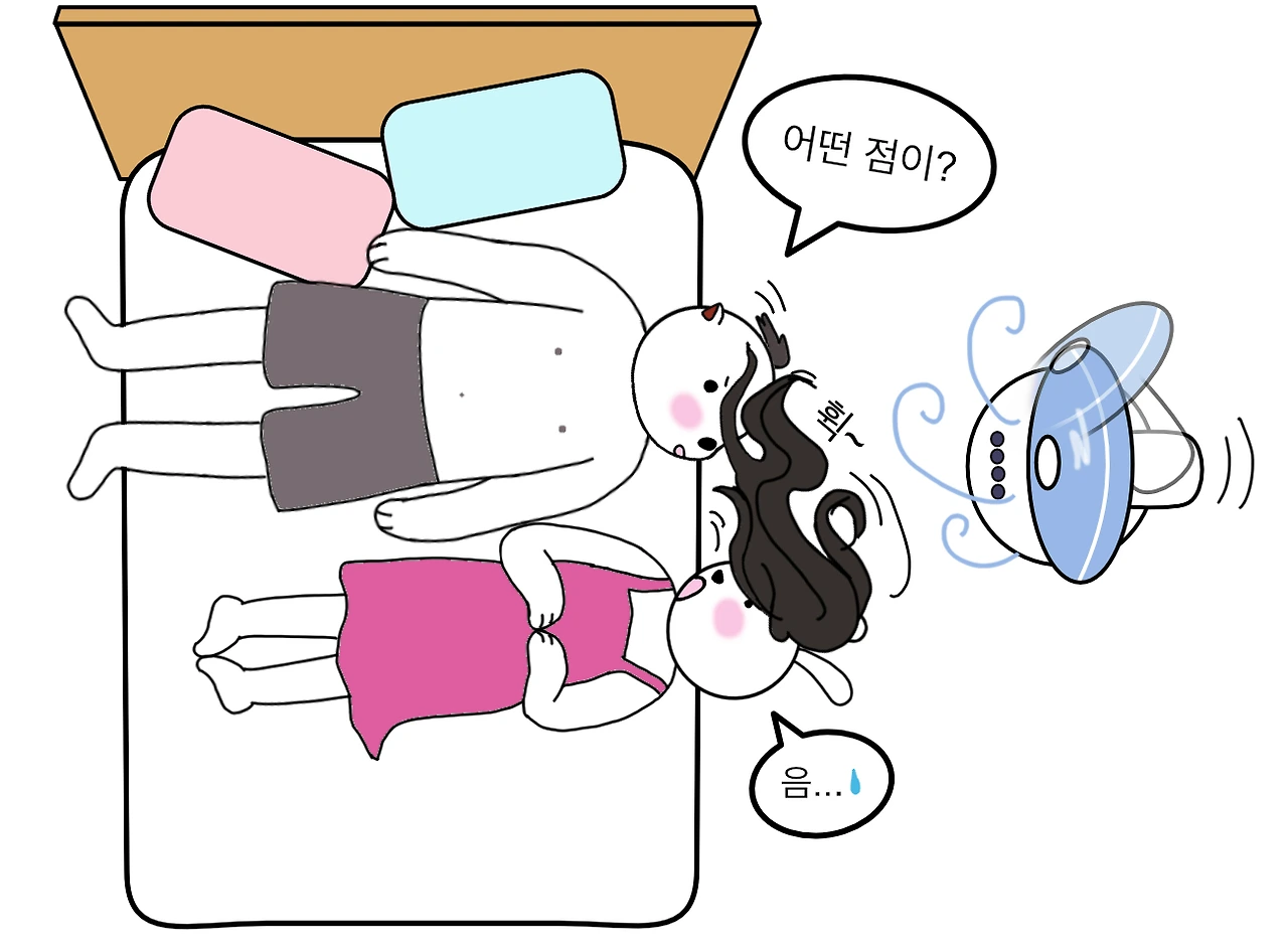 시원~ 하게 샤워를 하고 나란히 침대에 누워서 선풍기 바람에 머리를 말린다~