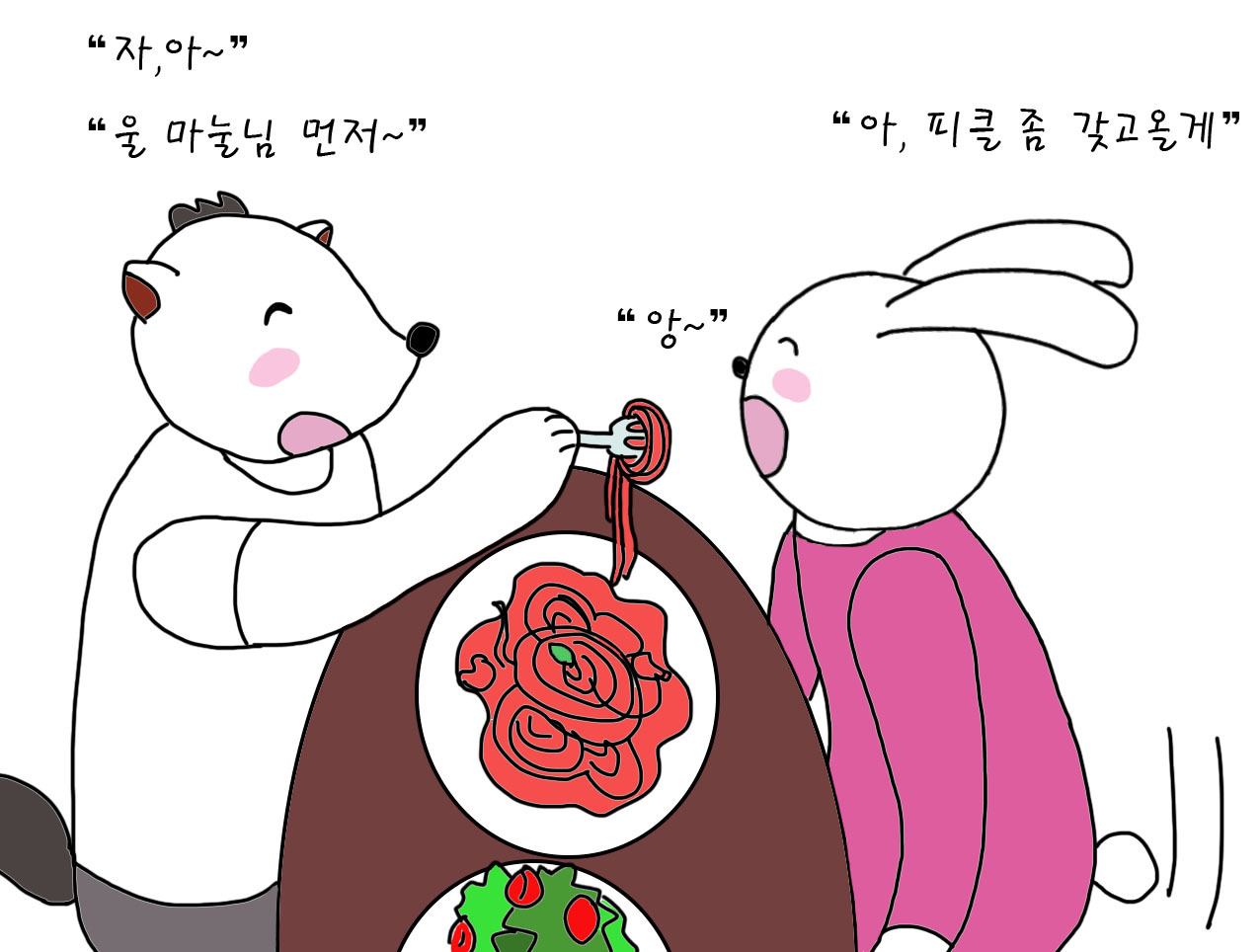 식사가 늦어져 배가 많이 고플 텐데, 그래도 남표니는 먼저 먹지 않고 내가 앉을 때까지 기다려 준다.