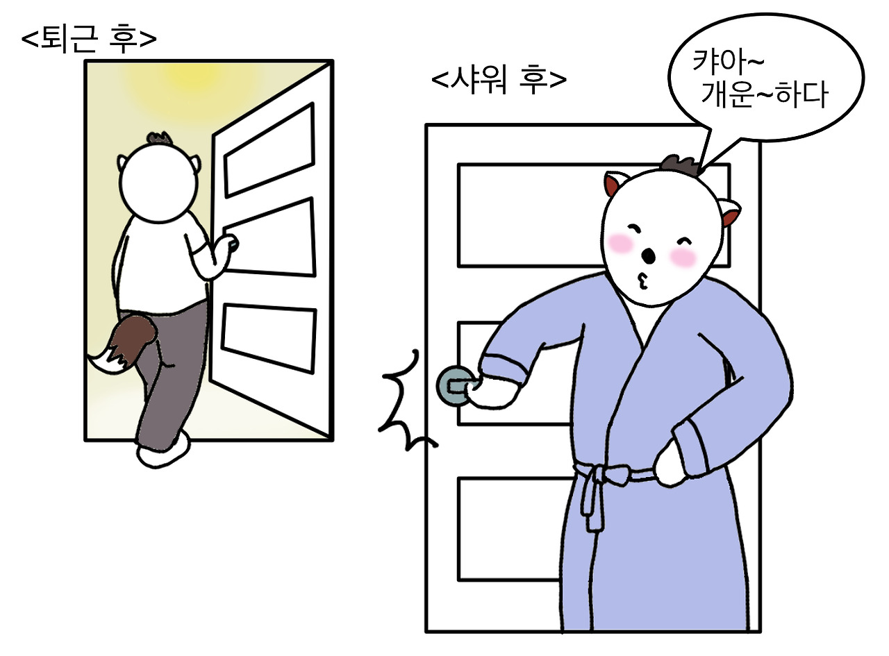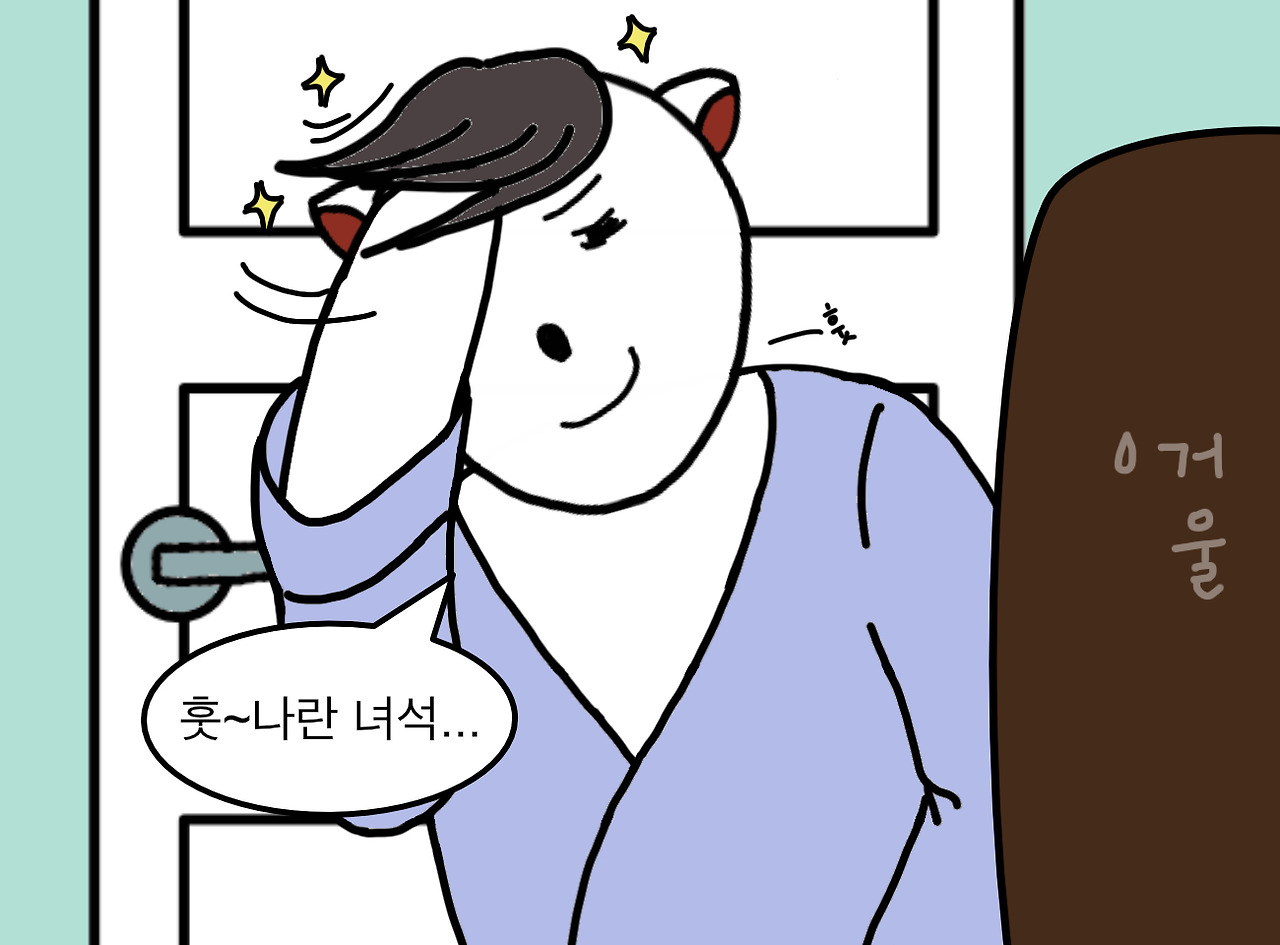 어김없이 욕실 앞 거울 보며 잘생김을 쥐어짜 낸다.