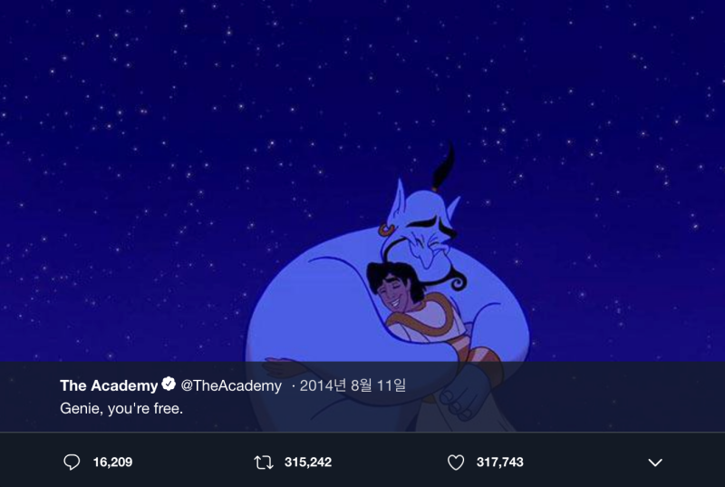 원작 애니메이션은 무려 30년 가까이 된 영화이지만, 내가 이 애니메이션을 접한 것은 5년 정도 전이었다. 지니의 성우를 맡은 로빈 윌리엄스가 세상을 떠나, 그를 기리는 “Genie, you’re free.” 트윗이 마음을 울릴 때였다.