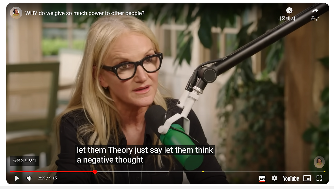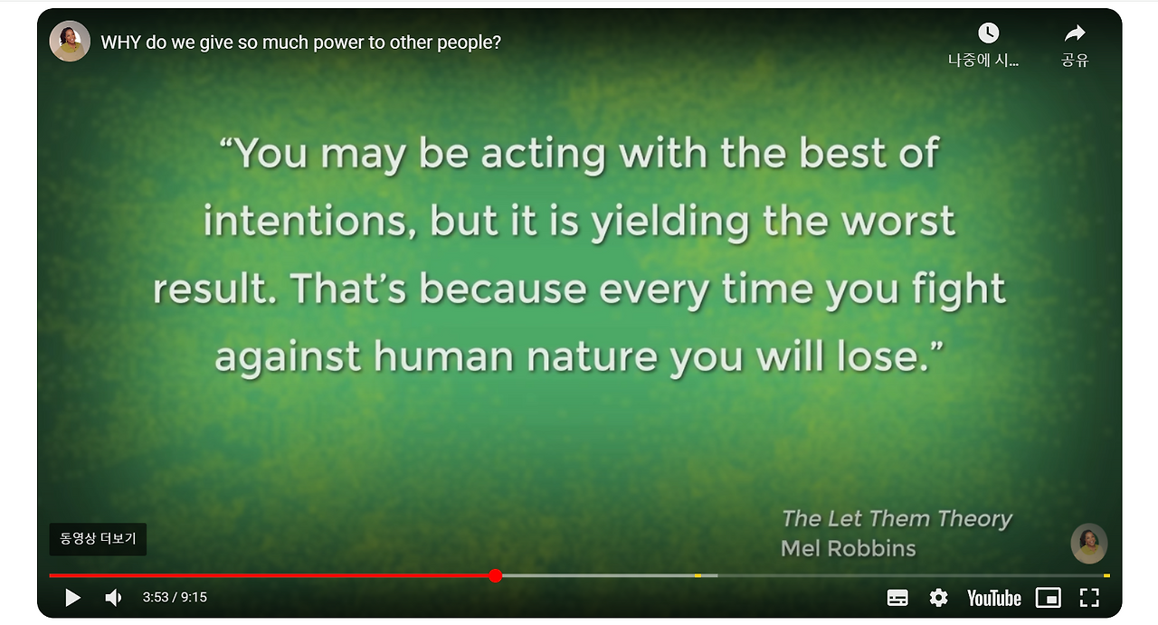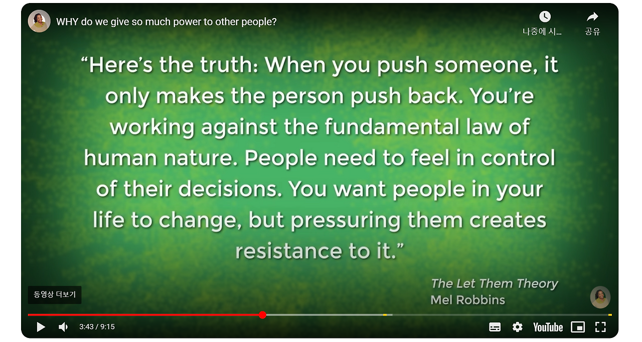 상대가 요청도 하지 않았는데 조언, 충고, 제안 등을 하는 경우 압력으로 받아들여지게 되고, 저항하게 만들게 할 뿐이고, 결국은 두 사람의 관계에는 거리가 생긴다고 Mel은 주장합니다. 사람들은 모두 최선을 다해 살고 있고, 지금 잘 나가는 상황이 아닌 경우에는 이미 스스로 엄청난 스트레스를 자기 자신에게 주고 있는 힘든 상황임이 분명하기 때문에 “렛뎀 이론 Let Them Theory,” 즉 “네 마음대로 해”라는 대화를 나누게 되면, “생전 처음으로 타인이 자기들 기준에서 함부로 판단해 버리는 게 아니라 있는 그대로의 자기 자신을 받아들이는 즉, 인정받는 느낌을 받는다”라고 말합니다. “네 마음대로 해봐”라는 말은 두 사람의 관계에서 거리가 생기게 되고, 당사자는 상대방의 지지 속에서 자력으로 자신의 잠재력을 발휘하게 됩니다.
