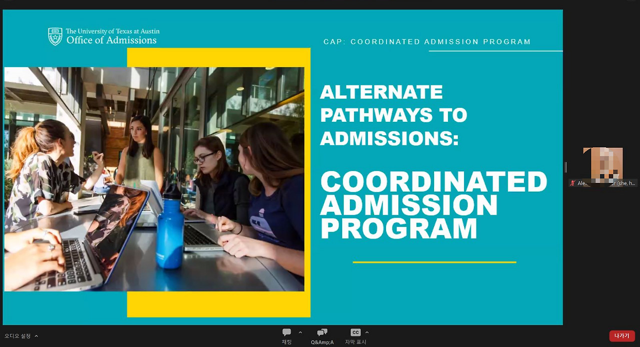 짱: "엄마도 알겠지만, UT는 텍사스주의 서울대학교야. 아주 잘하는 애들이 와. 그래서 해 본거야."