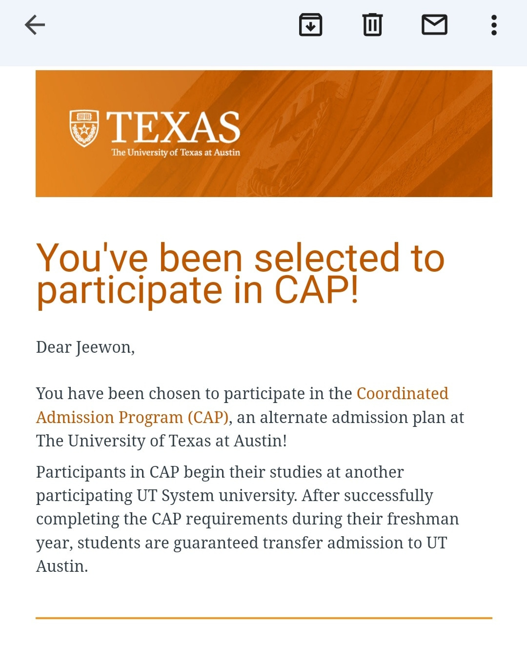 짱: "여러분, 나 UT에서 메일 받았어. 합격메일 같아. 근데 뭐가 조건이 붙은 것 같아."