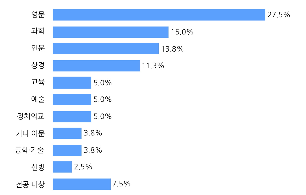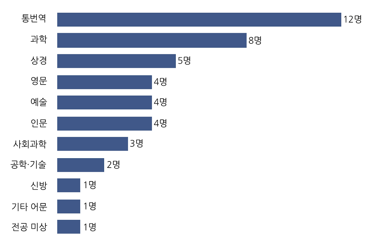 보다시피 통번역대학원을 나온 사람이 가장 많다. 이들의 학부 전공을 보자면 영문학 5명, 과학 3명, 상경계 2명, 사범대 1명, 전공 미상이 2명이고, 이중에는 학부 전공이 영문학과 경영학으로 2개인 사람이 1명 포함되어 있다.