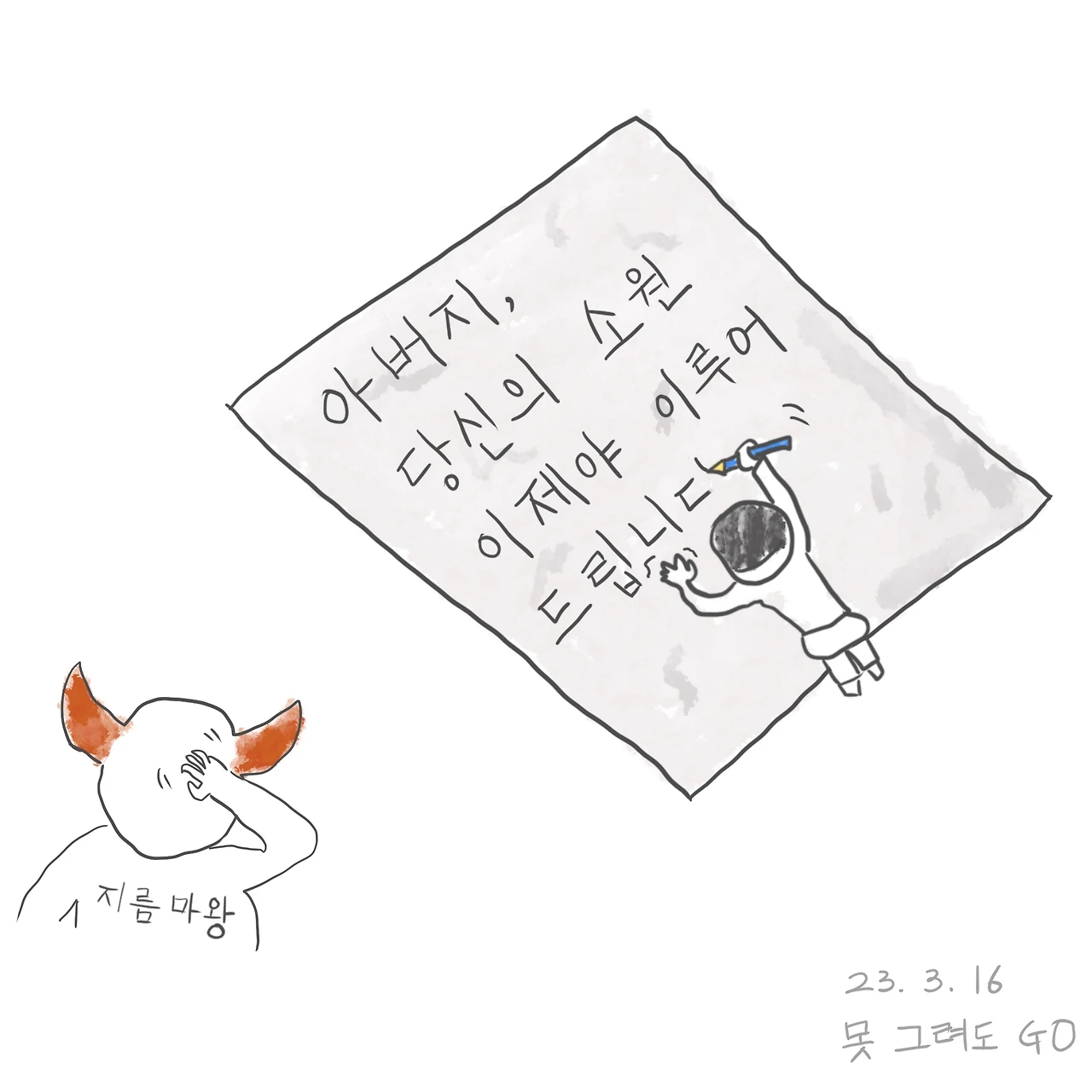 그러나 오늘부터는 큼직하게 쓰기로 했다. 아버지 생전의 소원대로.