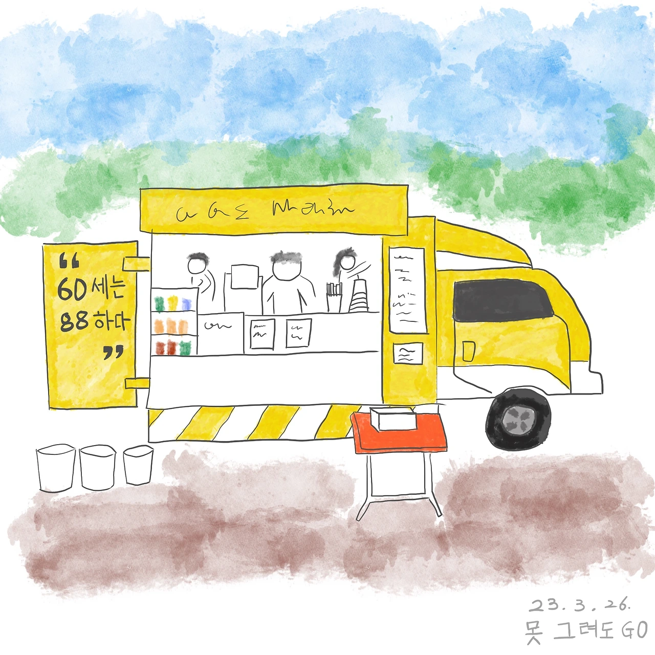 오늘 월아산 숲속의진주라는 숲에 나들이를 갔더니 할머니 세 분이 영업하는 카페 트럭이 있었다. 시에서 노인 일자리 창출을 위해 운영하는 것 같았다. 관찰력 좋은 우리 첫째가 집에 와서 "언니, OOO해" 하면서 재현하는 억양을 들으니 세 분이 꽤 즐겁게 일하신 듯하다.