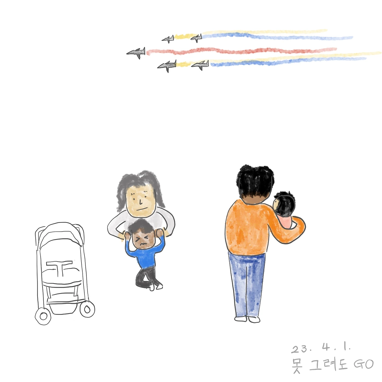 예민한 첫째(6세)는 에어쇼가 두 번째인데도 너무 시끄럽다고 힘들어한 반면 무덤덤한 둘째(13개월)는 생전 처음인데도 울지도 않고 잘 봤다.
