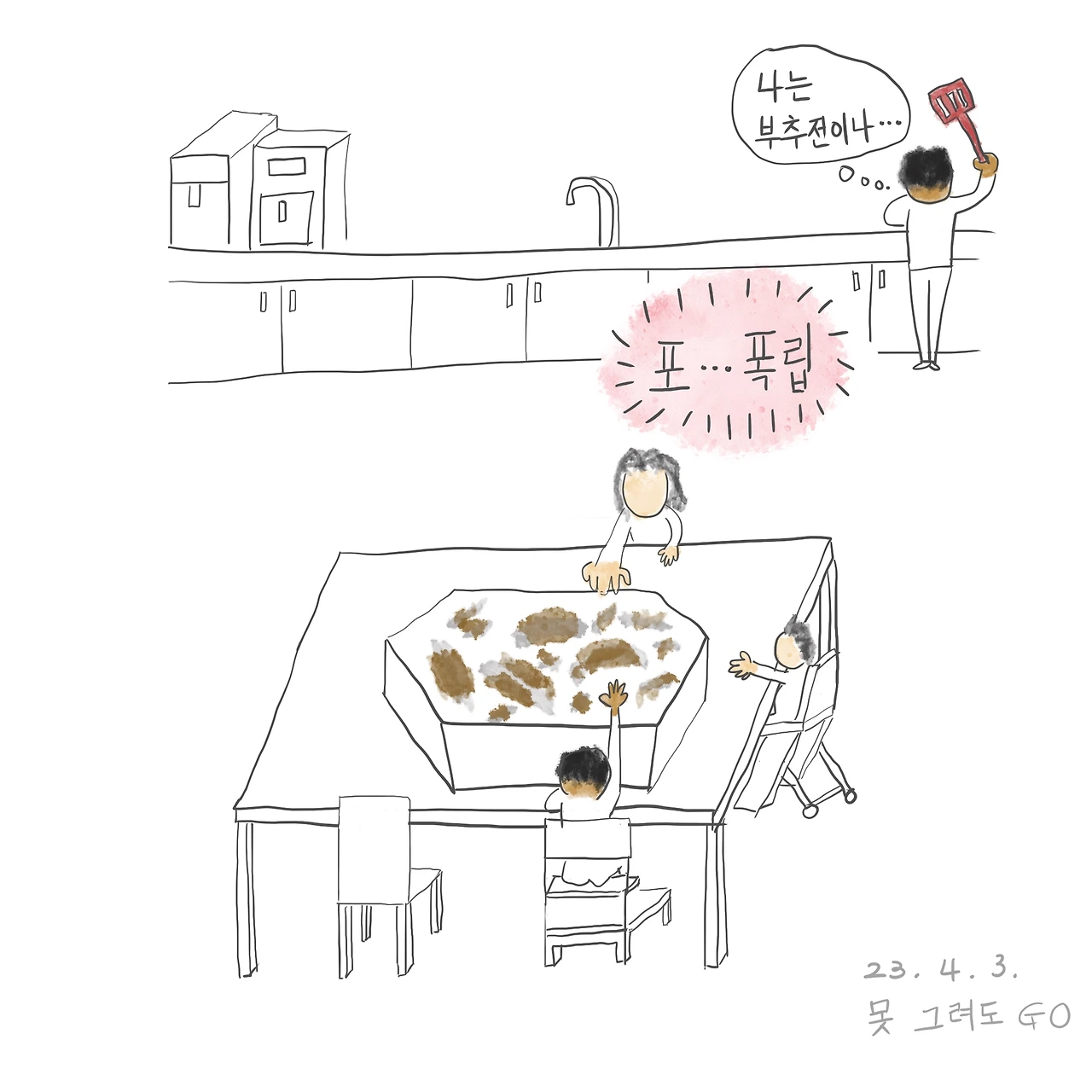 이제는 둘째까지 등갈비 맛을 알아서 오늘은 내 양을 더 줄여야 했다. 그래서 폭립을 식탁에 차려주고 나는 금요일에 부치고 남은 부추전 반죽을 마저 부쳤다.
