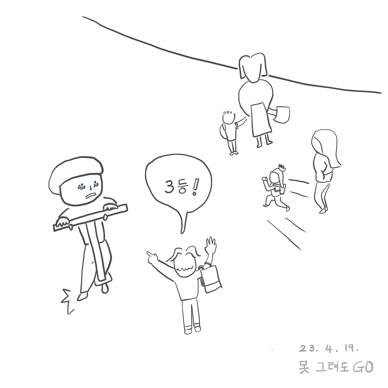 아침에 유치원 버스 기다리는 줄 1등 안 해도 상관없다던 첫째는 열심히 킥보드를 달려서 갔지만 3등을 하자 눈물을 글썽이며 앙탈을 부렸다.