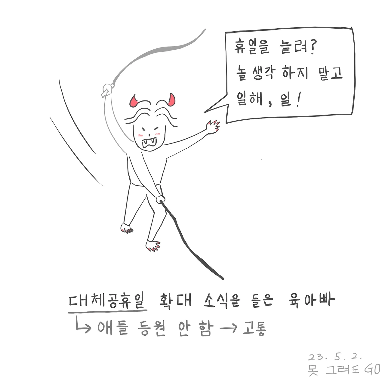 와 이 사람들 너무하네. 휴일=풀타임 육아=중노동인데 그걸 또 늘린다고? 그런 건 나중에 우리 애들 초등학교 졸업하면 좀 하지!