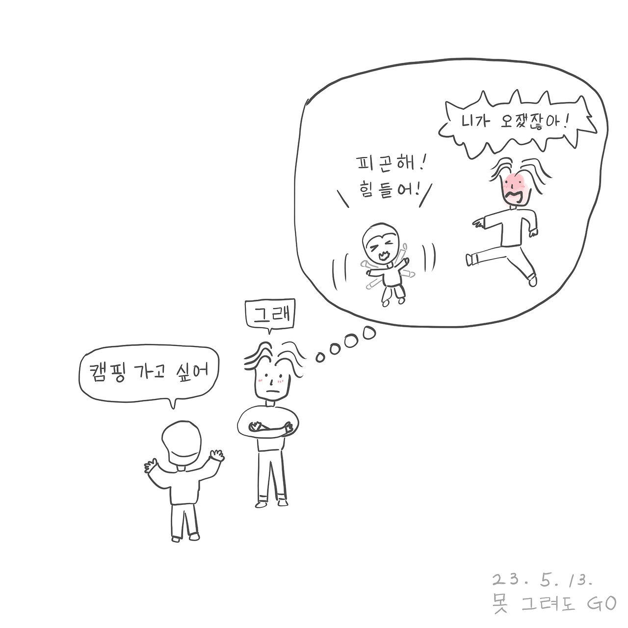 근데 이제 돌 지난 둘째까지 데리고 캠핑이라니…… 사실 첫째가 제일 문제다. 좀 피곤하면 짜증 내고 난리 치면서 사람 속을 박박 긁어놓기 때문에 어디 갔다 들어오면서 "너 이럴 거면 이제 나가지 마!"라고 혼날 때가 부지기수다.