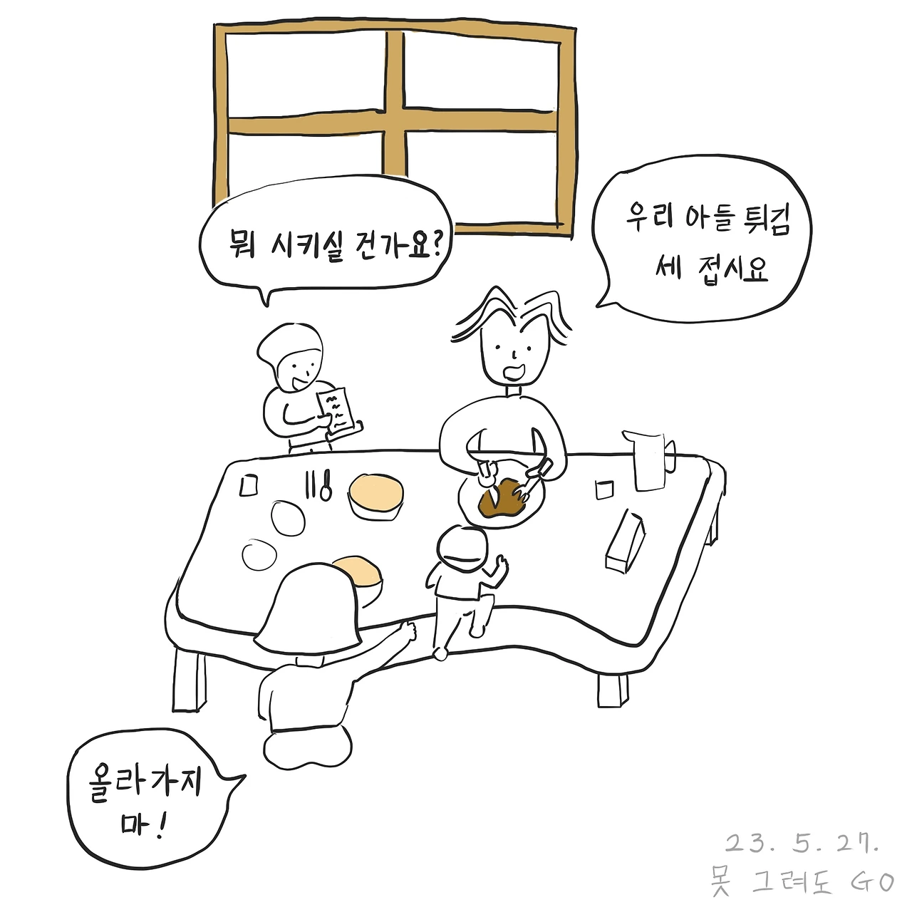 오전에 일부러 차 타고 먼 놀이터에 갔는데 20분쯤 놀고 첫째가 물을 찾았다. 근데 내가 가방을 챙기면서 깜빡하고 첫째 물과 간식을 안 챙겼다. 그때부터 첫째 징징대기 시작하면서 놀이터 나들이 폭망.