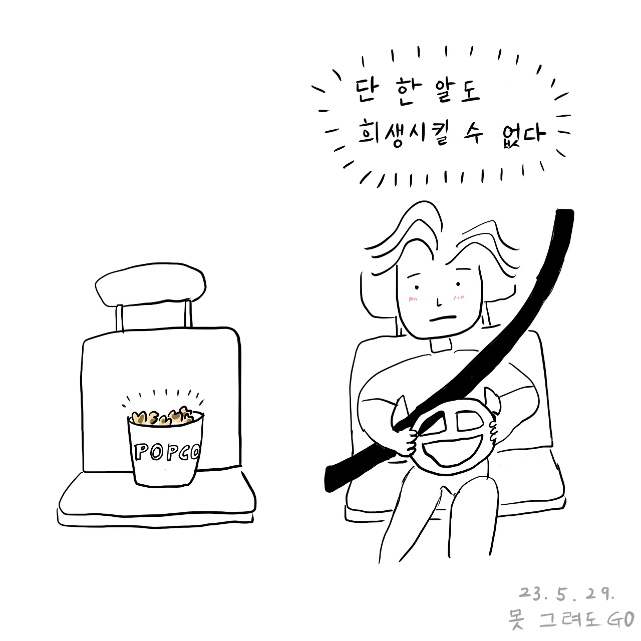 어제 먹었는데 오늘 또 팝콘을 먹고 싶다 하여 영화관에서 사 왔다. 어제는 첫째가 제 품에 꼭 안고 있었지만 오늘은 나 혼자라 조수석에 둘 수밖에 없었다. 흔들리면 아까운 팝콘 떨어지니까 어느 때보다 조심히 차를 몰았다. 한 알도 안 떨어트리고 무사히 귀환했다.
