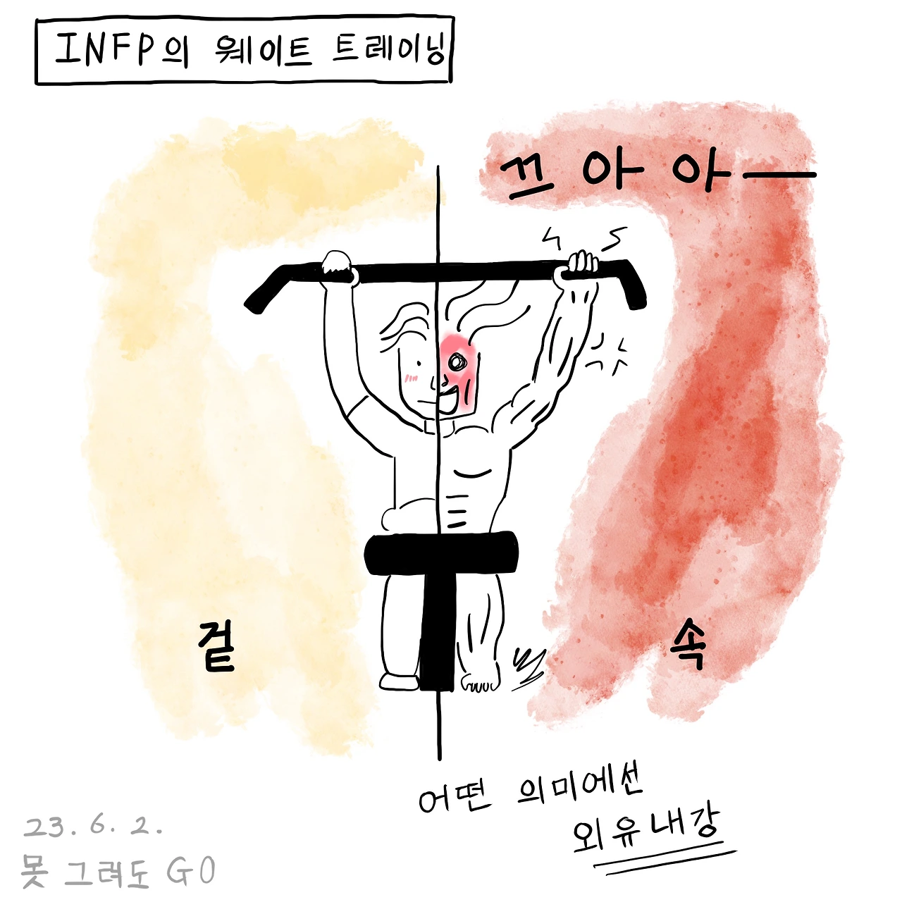 헬스장에서 외면의 나는 지극히 평온하다. 그저 입으로 후우후우 숨만 뱉을 뿐이다. 왜냐하면 무게도 별로 못 치면서 막 기운 쓰는 척하기 민망해서.