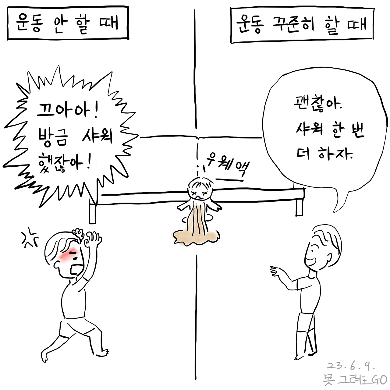 왜냐하면 일주일 동안 꾸준히 헬스장 가서 1시간씩 운동했거든. 애 보는 게 힘들긴 매한가지라도 체력의 절대치가 커지니까 확실히 마음에 여유가 생겼다.