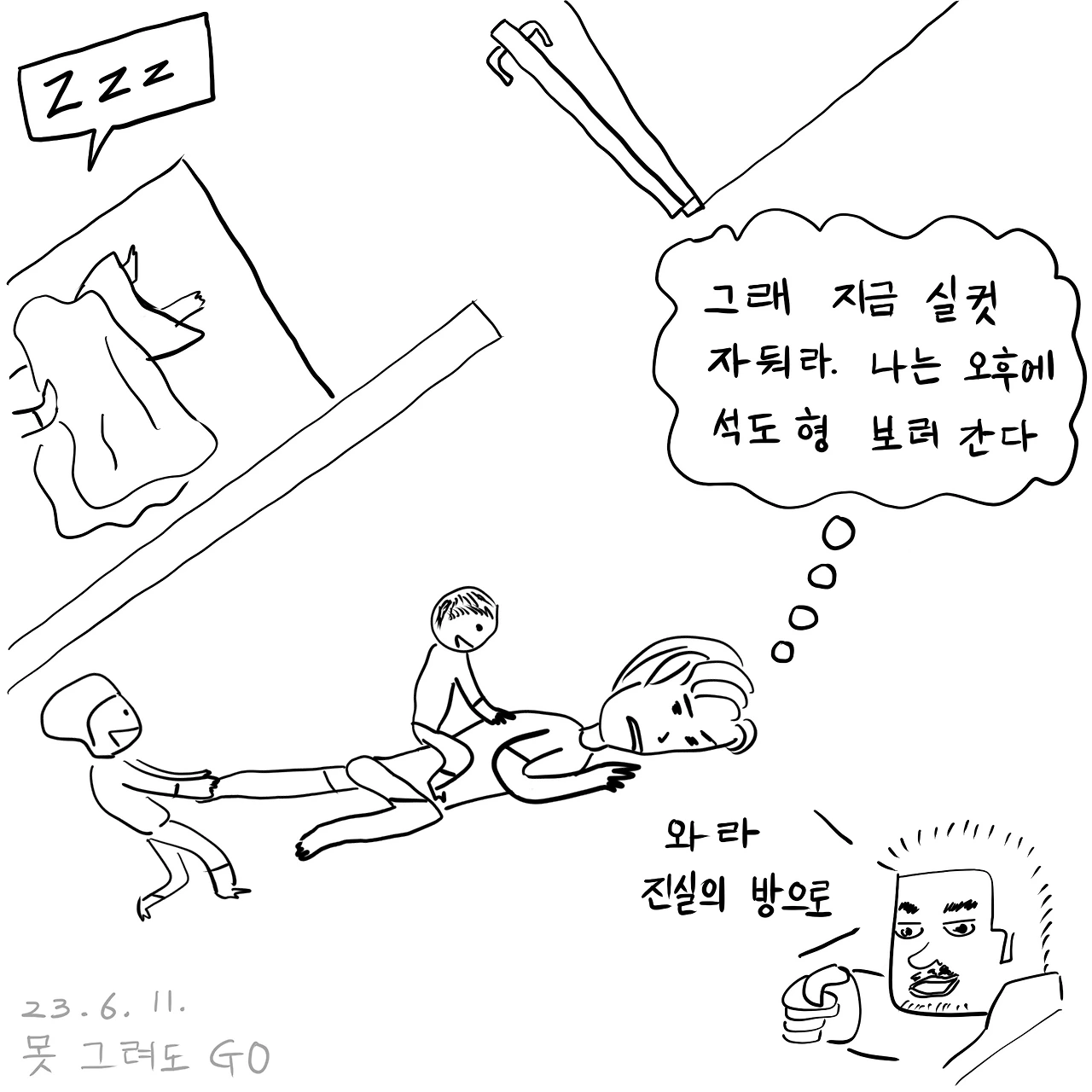 오전 내내 아내 자는 거 가만 놔두고 혼자서 애들 봤다. 일주일 동안 운동해서 비축한 체력이 방전됐다. 마침내 아내가 일어났을 때 선언했다.