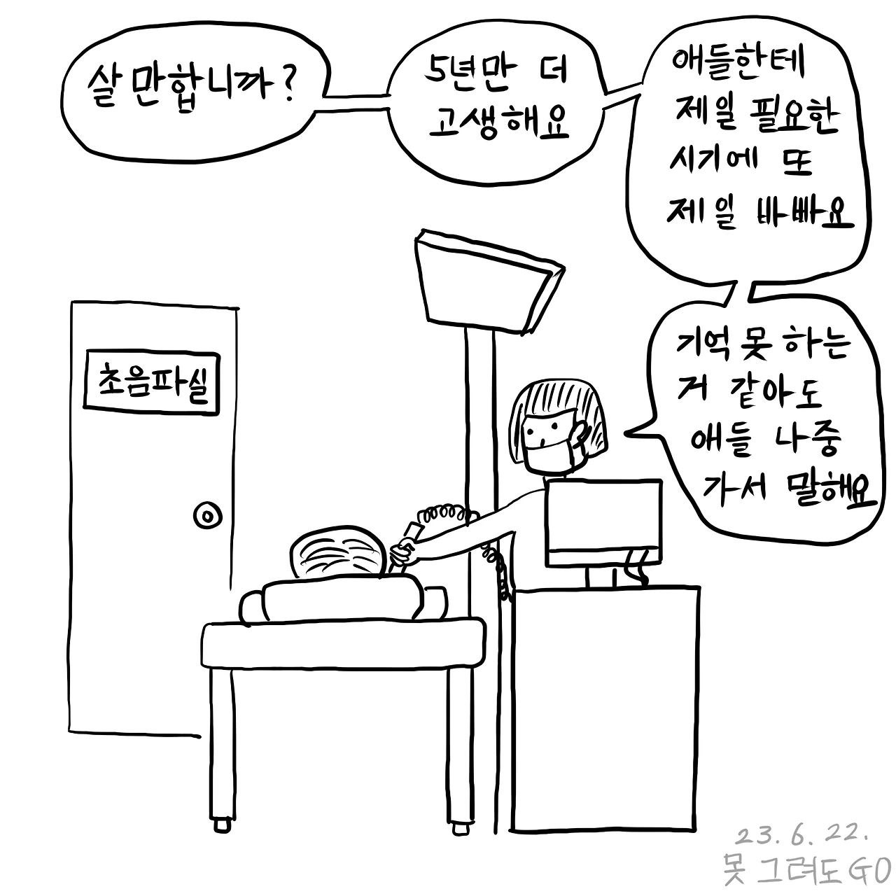 일찍 죽으면 안 된다고 나라에서 반년마다 간암 검사를 시켜준다. 내가 다니는 병원은 선생님이 항상 어떻게 사는지 묻고 거기에 대해 이런저런 얘기를 해주시는데 오늘은 요즘 여섯 살, 두 살 애들 때문에 너무 힘들다고 했더니 지금이 제일 힘든 시기인 건 맞는데 한 5년만 지나면 편해진다고, 그때까지만 더 고생하자는 마음으로 살라고 하신다. 돌아보면 지금이 제일 좋은 때라고. 육아 선배들은 모두 그렇게 말한다. 나도 빨리 그렇게 말할 때가 왔으면 좋겠다.