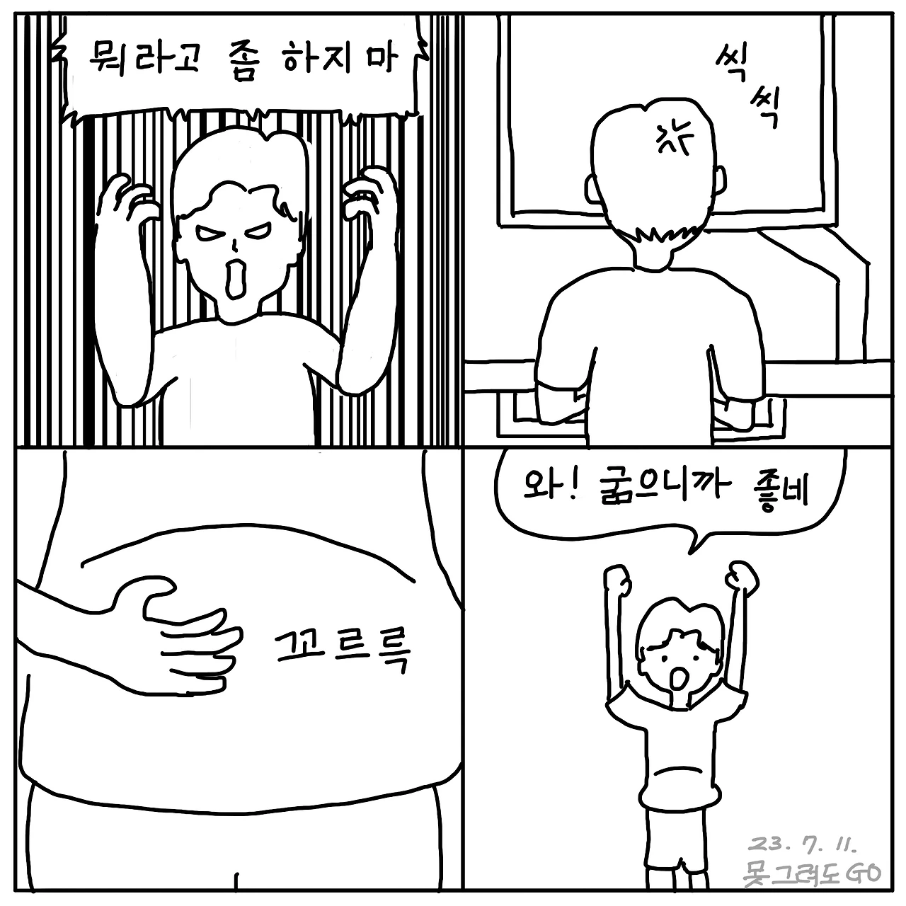 애 앞에서 아내랑 소리 지르면서 한 판 붙고 밥 생각 없어서 점심을 굶었더니 요 며칠 내내 더부룩했던 속이 싹 나았다.