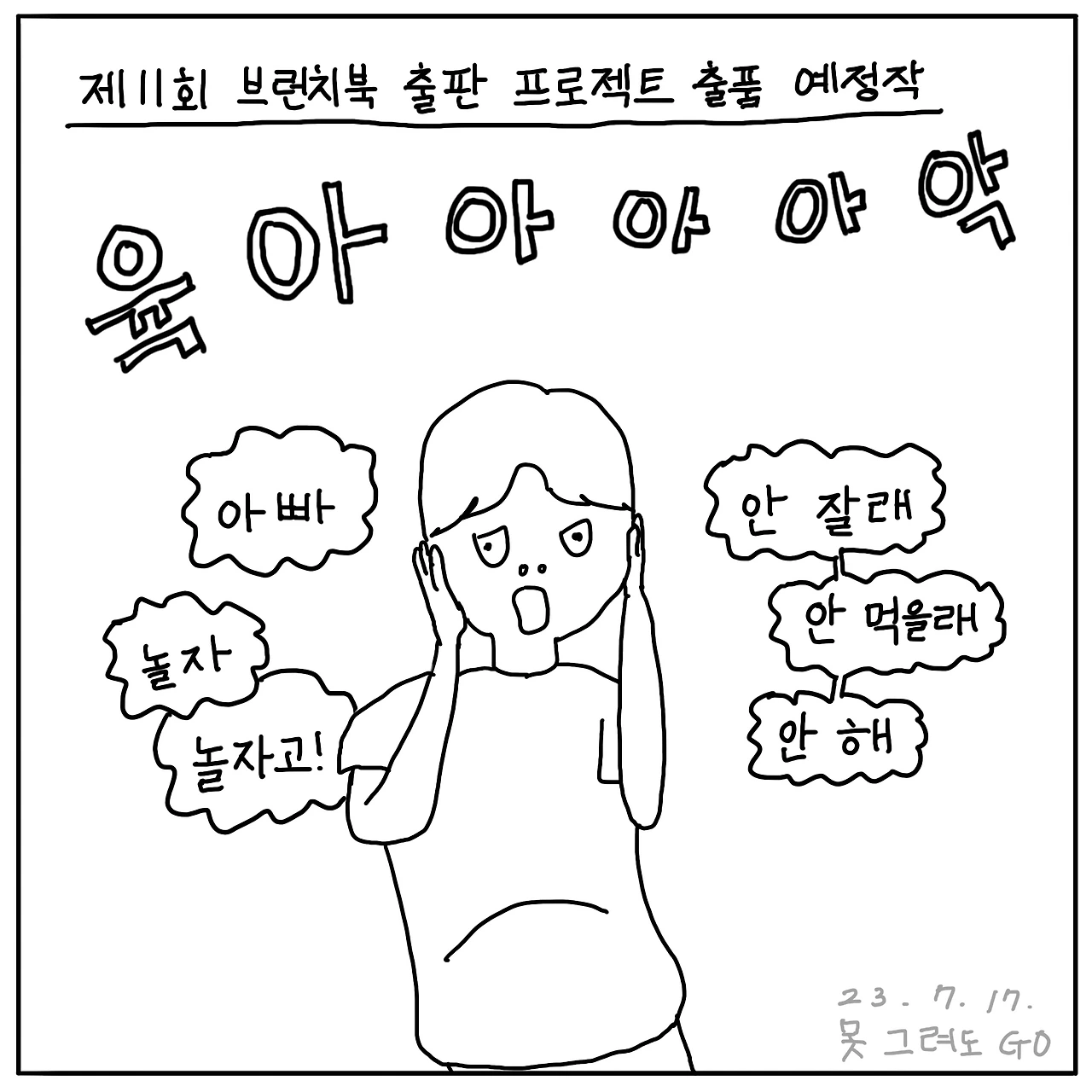 올해도 출품한다. 이미 기획도 끝났다. 제목은 <육아아아아악>. 육아의 고단함을 보여주는 그림에세이다. 지금까지 육아에 대한 그림일기를 수십 편 썼고 앞으로도 쓸 테니까 그중에서 20편 선정해서 그림은 고칠 실력이 안 되니까 그대로 두고 글은 에세이 느낌 나게 다듬을 계획이다.