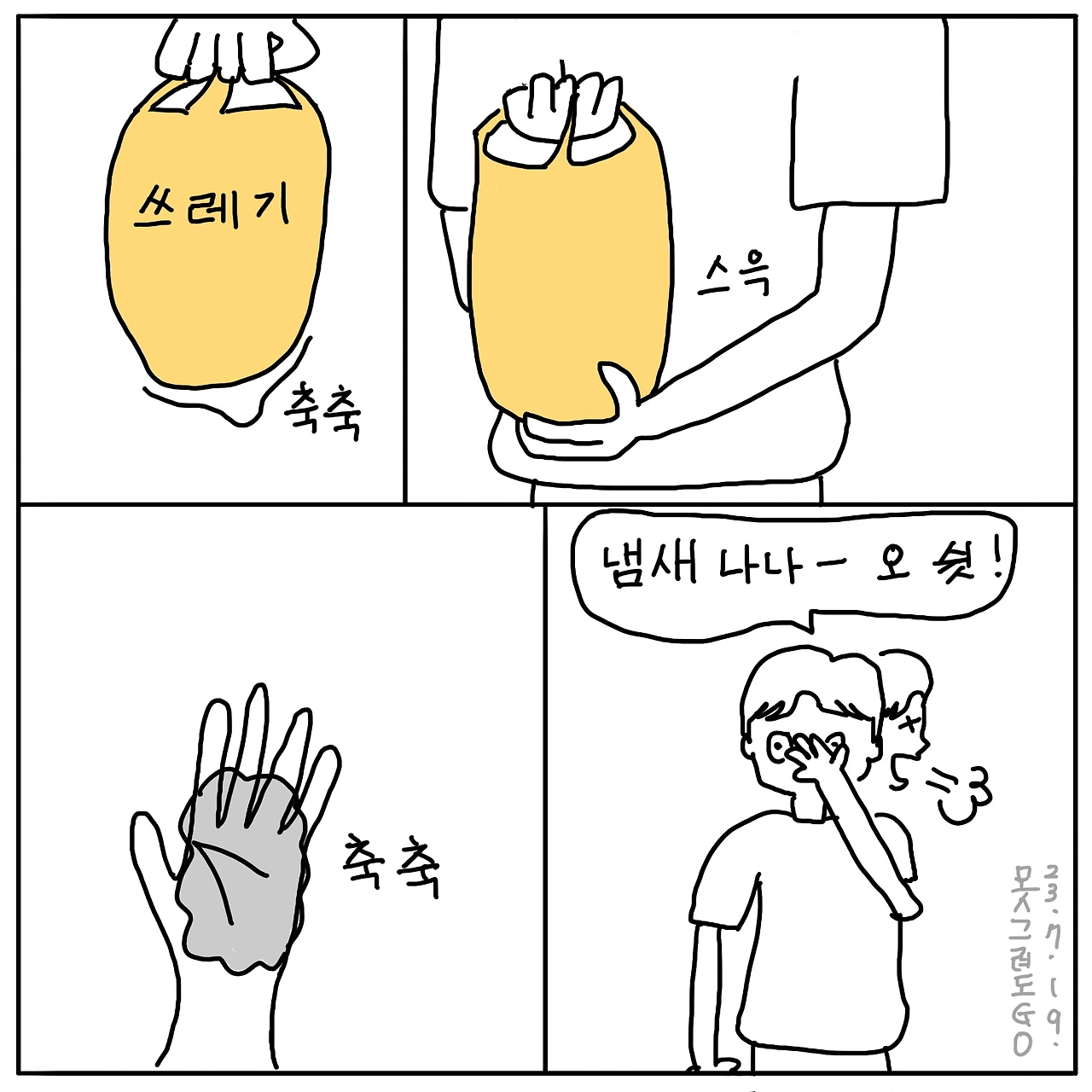 베란다에 며칠 방치된 쓰레기봉투에서 냄새가 심하게 나서 갖다 버리러 나가다가 봉투 바닥이 유모차 컵꽂이에 닿았다. 혹시 물기가 있었으면 컵꽂이에 묻었을 테고 그러면 닦아야 하니까 바닥을 만져봤다.