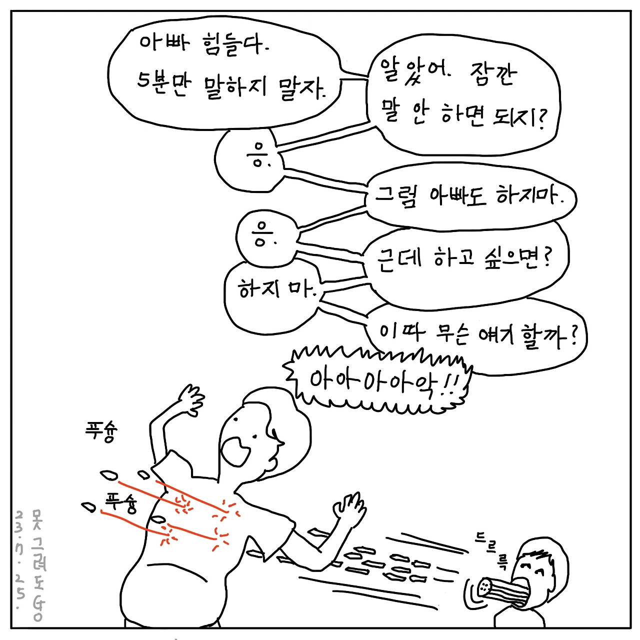 그래서 오늘은 5분만 말 시키지 말랬더니 알았다면서 무슨 끝말잇기하듯이 또 계속 말을 건다. 이제 방학 2일 차인데 벌써 에너지 방전이다.