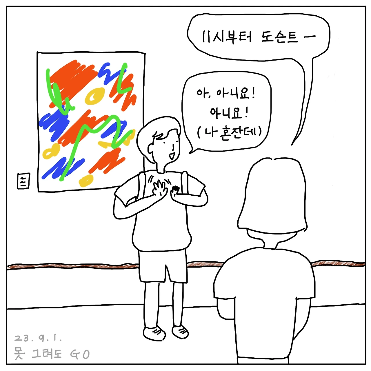 미술에 딱히 관심 있는 것도 아니고 그냥 쓱 둘러보고 있는데 갑자기 누가 오더니 "11시부터 도슨트 설명 있는데 들으시겠어요?"라길래 얼른 손사래치며 괜찮다고 했다. 아니 일대일로 듣는 거 너무 뻘쭘하잖아.