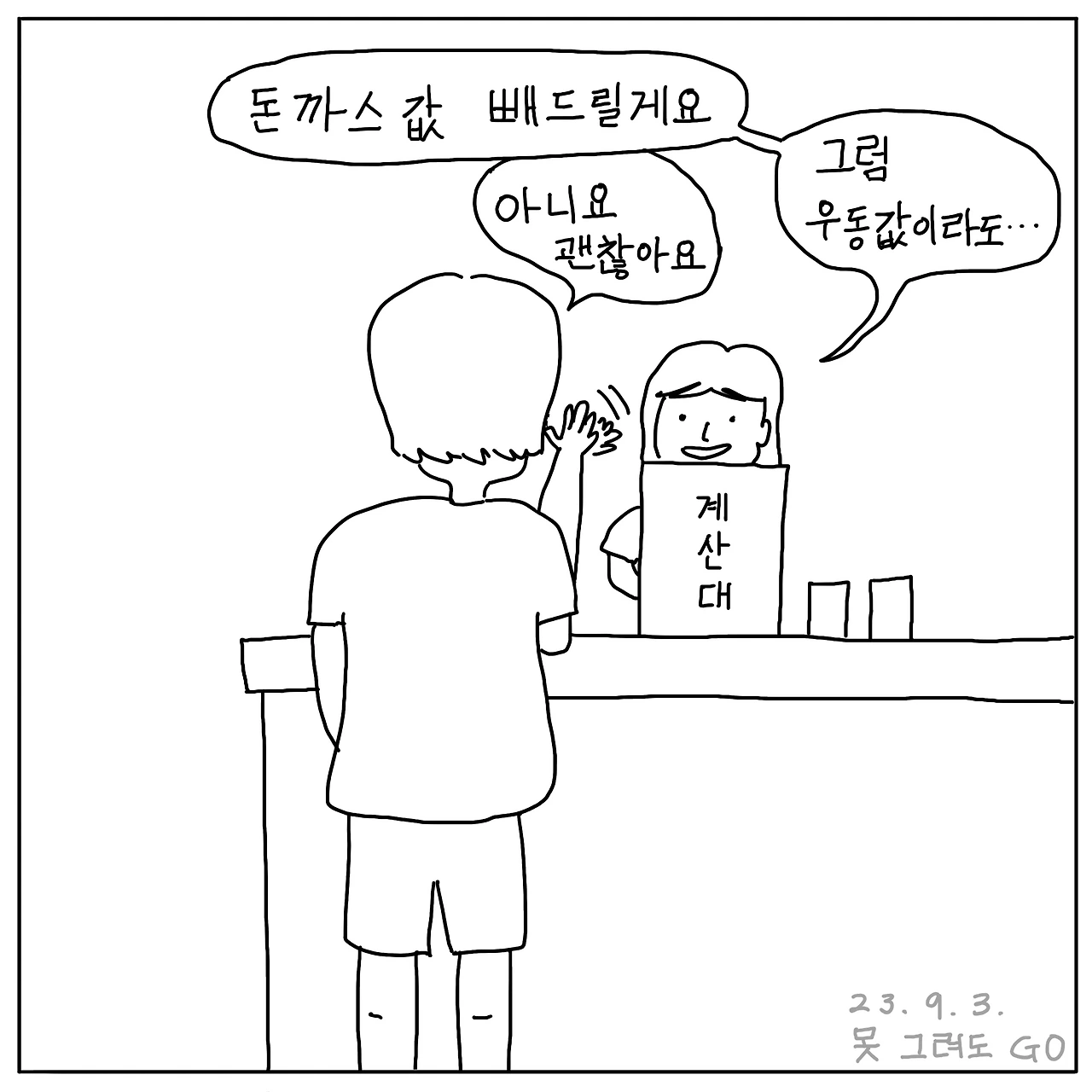 계산하려니까 돈까스값 빼준다는데 됐다고 했다. 그럼 우동값이라도 빼준다는 걸 됐다고 했다. 에이 돈까스 팔아서 얼마나 남는다고... 겨우 한 조각 못 먹은 건데.