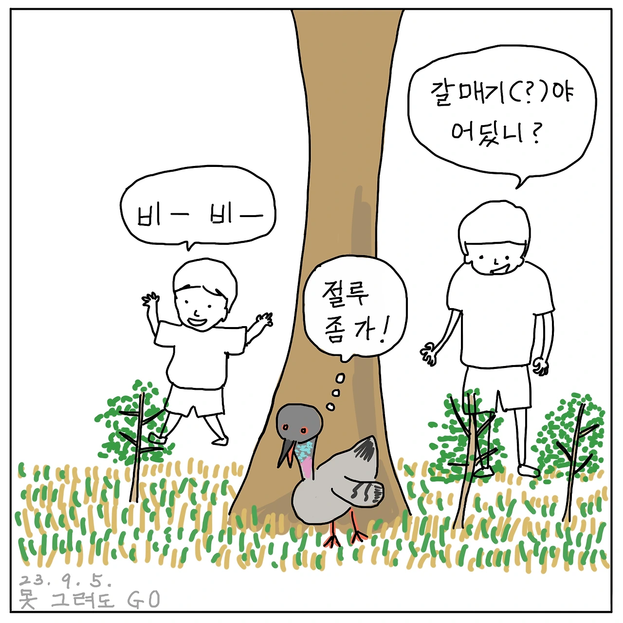 애들 하원시켜서 놀이터 갔더니 비둘기 한 마리가 관목 사이에서 유유히 산책 중. 둘이 신나서 비둘기 따라다니고 비둘기는 뒷짐 지고 어슬렁어슬렁 도망가고. 덕분에 10분 잘 때웠다. 그 와중에 첫째는 자꾸 비둘기한테 갈매기라고. 코뿔소와 코끼리도 자주 헷갈리는 여섯 살.