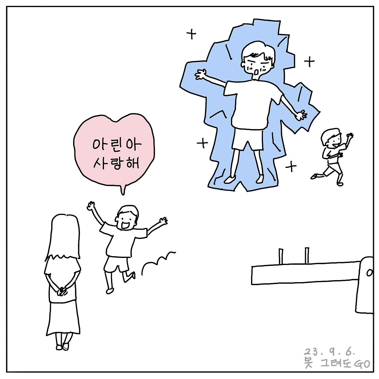 급기야는 놀이터가 떠나가게 "아린아, 사랑해!"라고 외치면서 덥썩 끌어안는데 내가 너무 당황스러워서 고개를 돌리고 말았다. 여자애 표정은 못 봤지만 그러고서 잘 놀고 중간중간 같이 손도 잡고 다니는 거 보면 다행히 우리 애가 억지로 안은 건 아닌 것 같다.