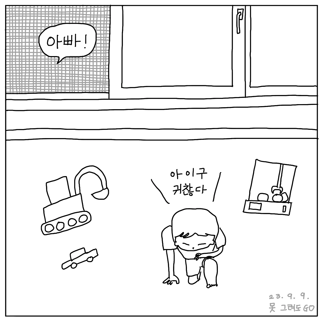 오늘은 저녁에 장모님이 애들을 데리고 놀이터에 가시고 나는 둘째 좀 늦게 일어나라고 안방 창문에 빛을 완전히 차단하는 뽁뽁이를 붙이고 있는데 밑에서 첫째가 부르는 소리가 들렸다.
