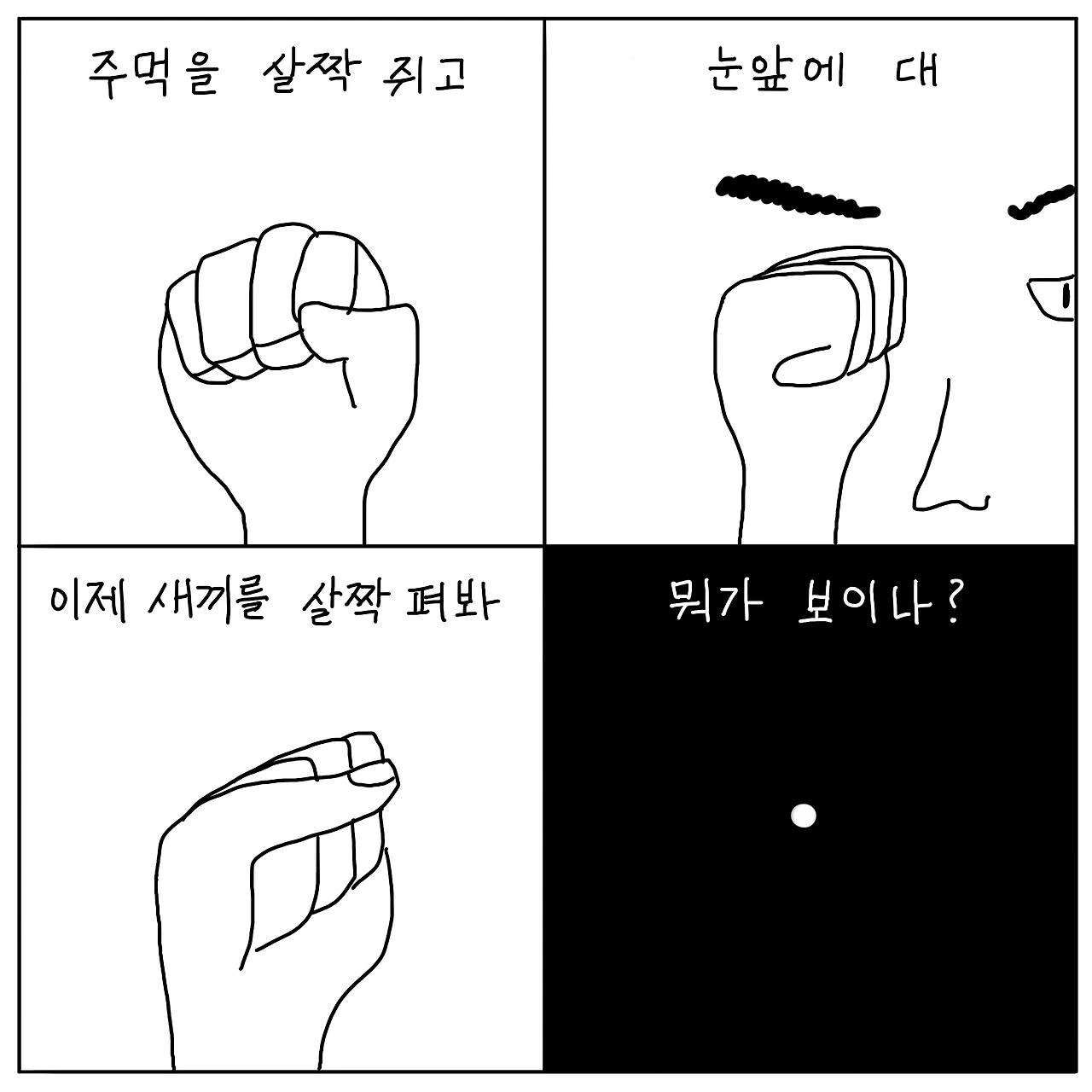 “주먹을 살짝 쥐고 눈앞에 갖다 대봐. 이제 새끼손가락만 조금 펴봐. 뭐가 보이나?”