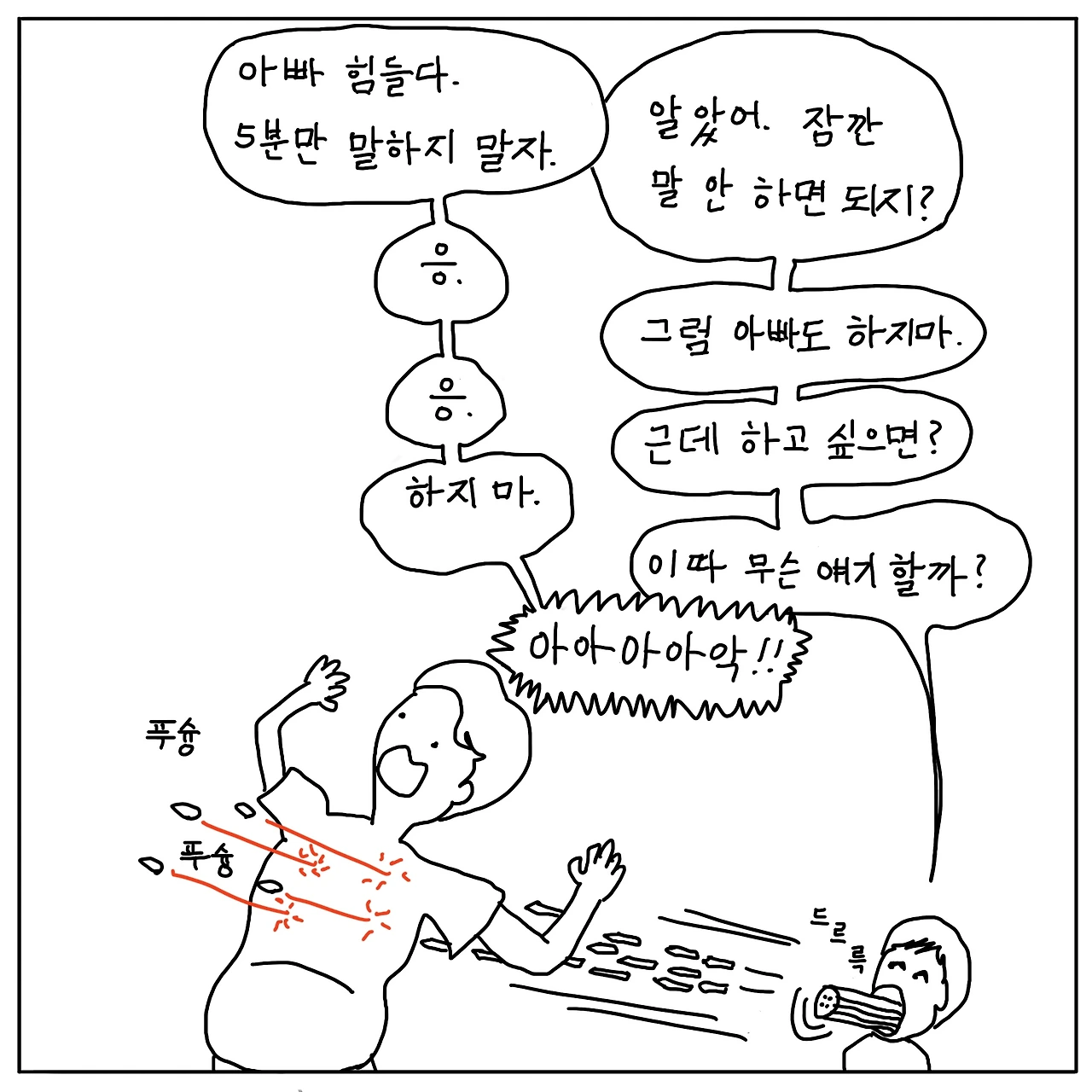 칼보다 강한 게 펜이라지만 펜보다 강한 게 우리 첫째 아가ㄹ…… 아가의 입이다. 입에 따발총을 달았다는 말을 피부로 느낀다. 총알이 푸슝푸슝 내 귀를 벌집으로 만든다. 아이는 장난감이나 TV에 집중할 때를 빼면 쉴 새 없이 말한다. 아니다. 장난감을 갖고 놀 때는 상황극의 감독 겸 주연이 되어 내게 끊임없이 대사를 요구하고, TV를 볼 때도 수시로 뭔가를 설명해주거나 묻고 동의를 요구한다. 그렇게 종일 떠든다. 탄창은 무한이다.
