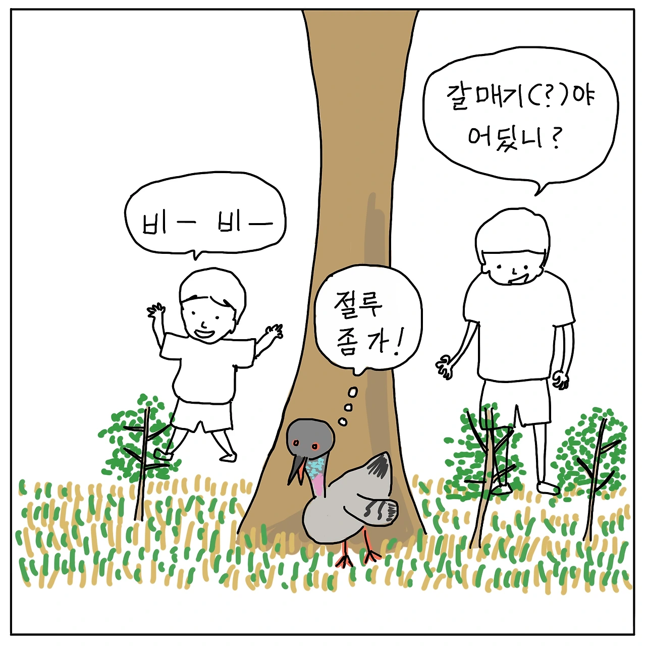그 말 한마디에 첫째가 수풀로 향하고 둘째도 종종걸음으로 뒤따랐다. 비둘기는 애들이 다가오자 뒤뚱뒤뚱 작은 나무 뒤로 숨었다. 아직 동물 이름이 헷갈리는 첫째는 “갈매기야, 어디 있니?”라며, 그리고 아직 어지간한 단어는 앞글자만 말하는 둘째는 “비! 비!”라며 비둘기를 찾았다. 고맙게도 게으른 비둘기는 날아가지 않고 계속 아이들을 피해 숨었다. 그렇게 한동안 숨바꼭질 아닌 숨바꼭질이 이어졌다. 하지만 비둘기도 아이들과 노는 게 버거웠던지 이내 무거운 날개를 휘적이며 떠났다. 왠지 긴 한숨도 내뱉은 것 같았다.