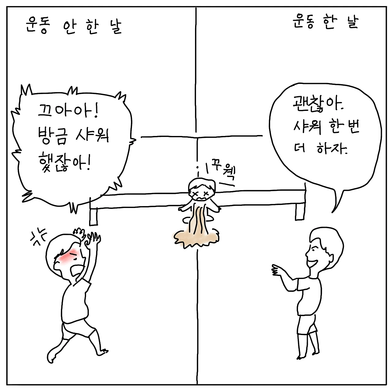 나는 그럴 때 대체로 가슴에서 주먹 하나가 쑥 올라오지만 어느 날인가는 주먹 대신 박수를 칠 만큼 어른스럽게 대처했다. 마음에 여유가 있었다. 왜인가 보니 운동을 한 날이었다. 까짓것 한 번 더 씻기면 되지. 안 힘들어. 나 오늘 쌩쌩하거든!