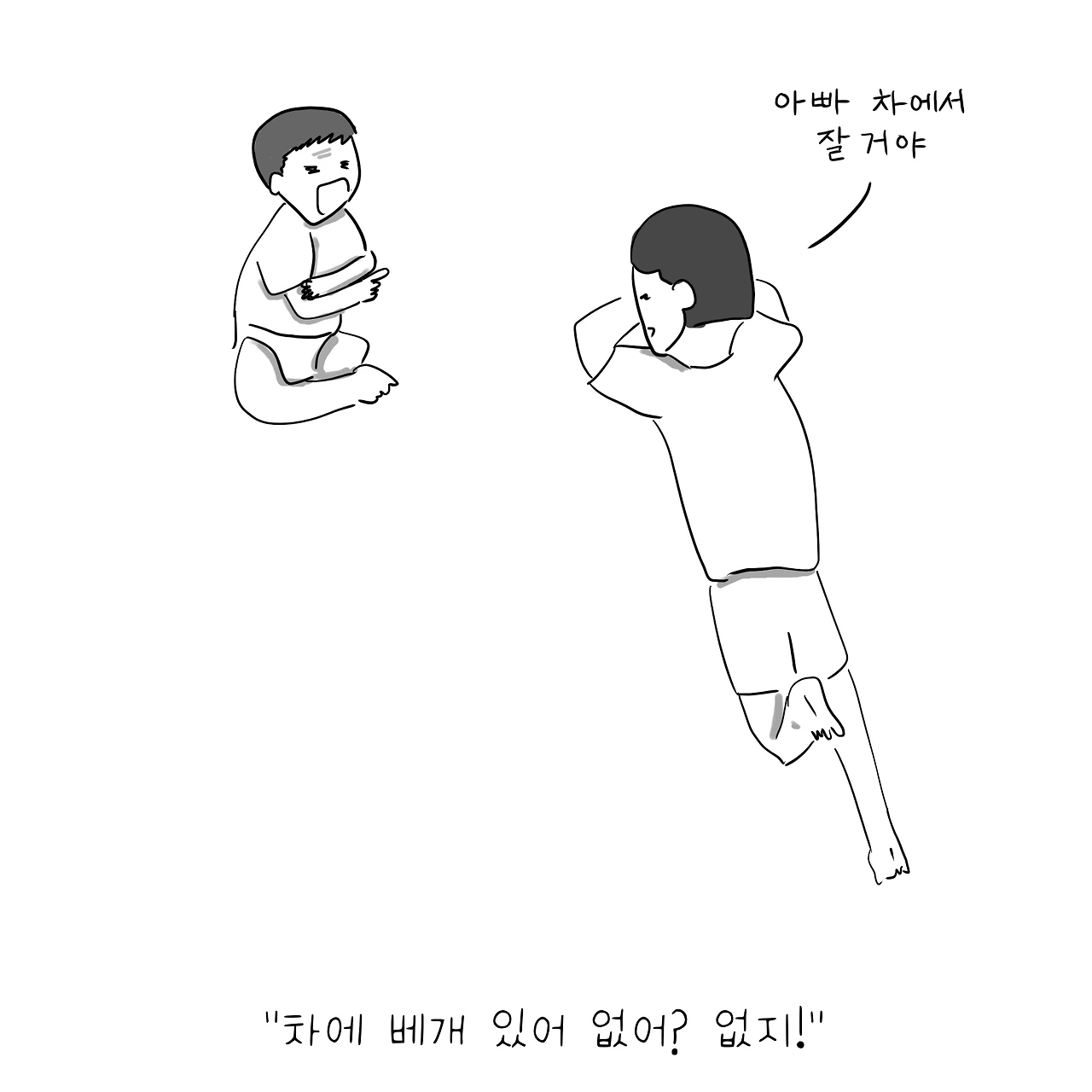 오늘 내가 엎드려서 장난으로 “아빠 차에서 잘 거야”라니까 “차에 베개 있어 없어? 없지!”라고 하는데 너무 논리적이라 반박 불가!