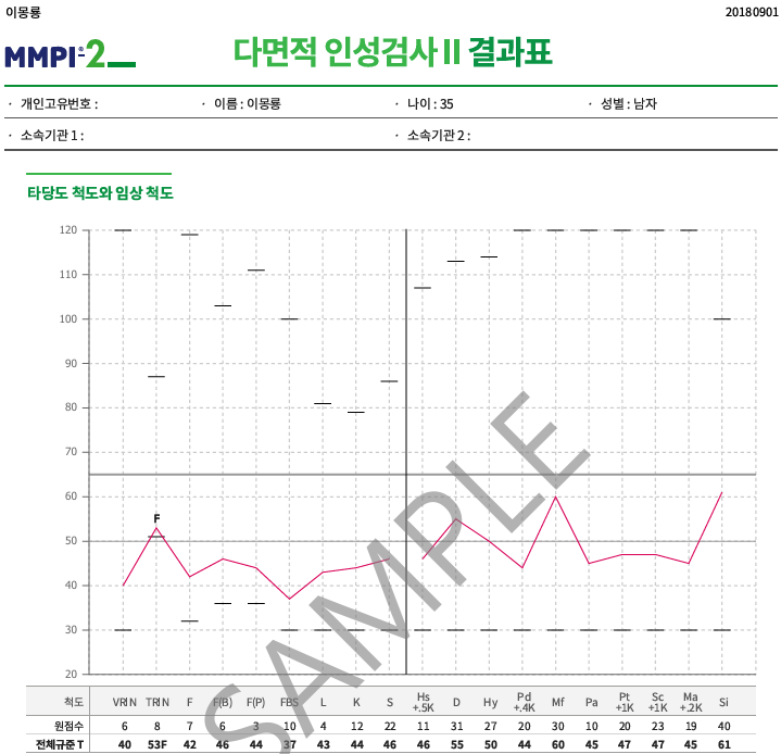 *다음은 대표적인 객관적 검사인 MMPI-2의 결과 샘플이다. 아래와 같이 피검자가 응답한 항목에 대해 임상 척도와 타당도 척도로 파악할 수 있고, 이는 개인의 심리적 특성과 정신병리적 경향을 객관적으로 측정할 수 있다.