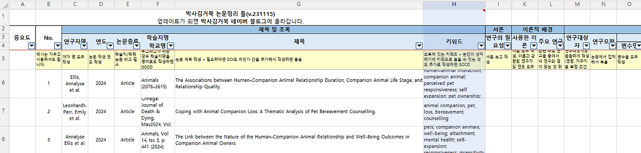 외상 후 성장에 대한 선행연구는 꽤 찾을 수 있었지만 연구대상자가 반려인으로 한정된 논문은 생각보다 많지는 않았다. 참고할 수 있는 국내학위논문, 국내학술지, 해외논문 등을 최대한 다양하게 찾았고 내가 진행할 연구에 참고할만한 사항을 한눈에 들어오도록 정리했다 (*논문정리 틀 출처: 네이버 블로그 논문쓰는 박사 김거북)