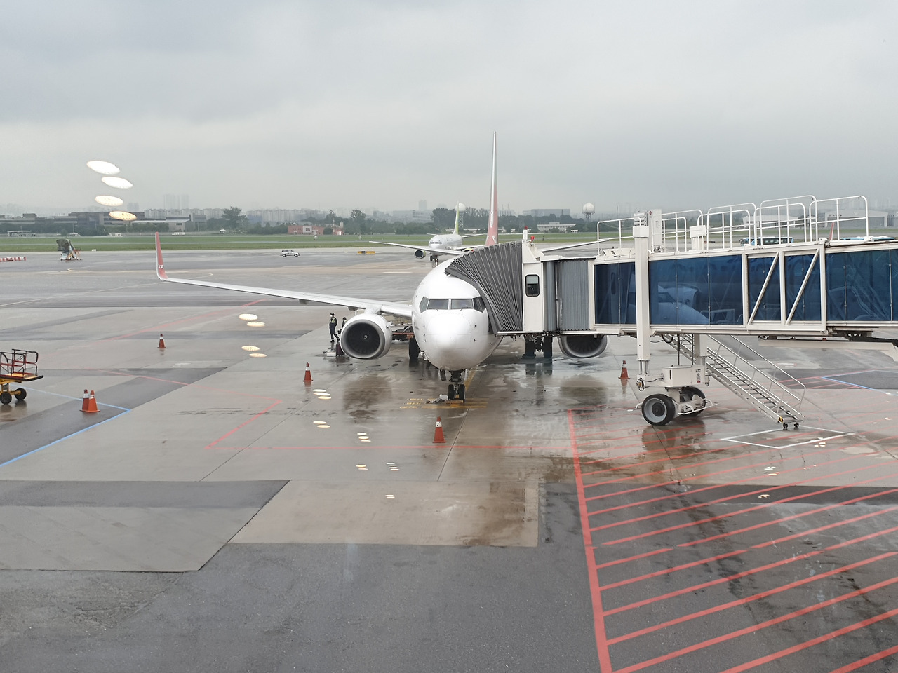 검색대에 들어오기 전 발권한 티켓에는 탑승구 6, 탑승시간 13:05, 좌석번호 22C라는 정보가 흑백으로 인쇄되어 있었다. 검색을 위해 꺼내놓은 짐들을 다시 주머니에 넣고 배낭을 다시 짊어진 후 6번 탑승구로 가기 위해 코너를 돌았다. 얼마 지나지 않아 좌측 편에 무빙워크가 보여 자연스럽게 올라탔다. 한 번의 무빙워크를 통과한 후에는 바로 이어지는 두 번째 무빙워크에 의심 없이 올랐는데 아차 하는 생각에 주위를 둘러보니 탑승구 6번이 이미 지난 상태였다. 첫 번째 무빙워크가 끝났을 때 안쪽으로 다시 들어가야 했던 것이다. 흐르는 강물을 거꾸로 거슬러 오르는 연어처럼 무빙워크를 거슬러 올라갈 순 없기에 두 번째 무빙워크마저 억지로 통과하고 나서야 길을 돌아 6번 탑승구에 도착했다. 탑승구 앞에 비치되어있는 4열 의자에 배낭을 내려놓고 앉으니 정면에 승객 탑승을 기다리고 있는 여객기가 보였다.