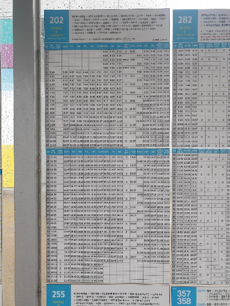 두 번째로 타야 할 버스는 해안도로를 따라 제주 서쪽을 향해 달려가는 202번 버스였다. 지도 어플은 서울과 달리 정확한 버스 위치를 제공하지 않았다. 다행히 버스 정류장에는 각 버스의 위치 별 도착 시간을 알려주는 표가 벽에 붙어 있었는데, 버스가 정차하는 모든 정류장에 대한 시간표는 아니어서 처음에는 뭐가 뭔지 잘 몰랐다. 주요 지점 위주로만 도착시간이 나와 있어 내가 서있는 정류장에 관한 정보는 정확히 알기 어려웠다. 하지만 스마트폰에 나와있는 모든 정류장의 이름을 훑어보며 내가 서 있는 정류장이 벽에 붙어있는 시간표에 나타나 있는 주요 정류장들 중 어디 사이에 있는지가 확인되자 대충의 도착시간을 유추해 볼 순 있었다. 못해도 20여분 안에는 버스가 도착할 것 같았다.